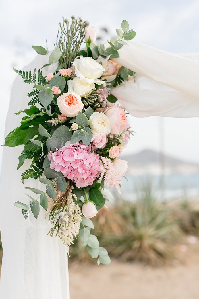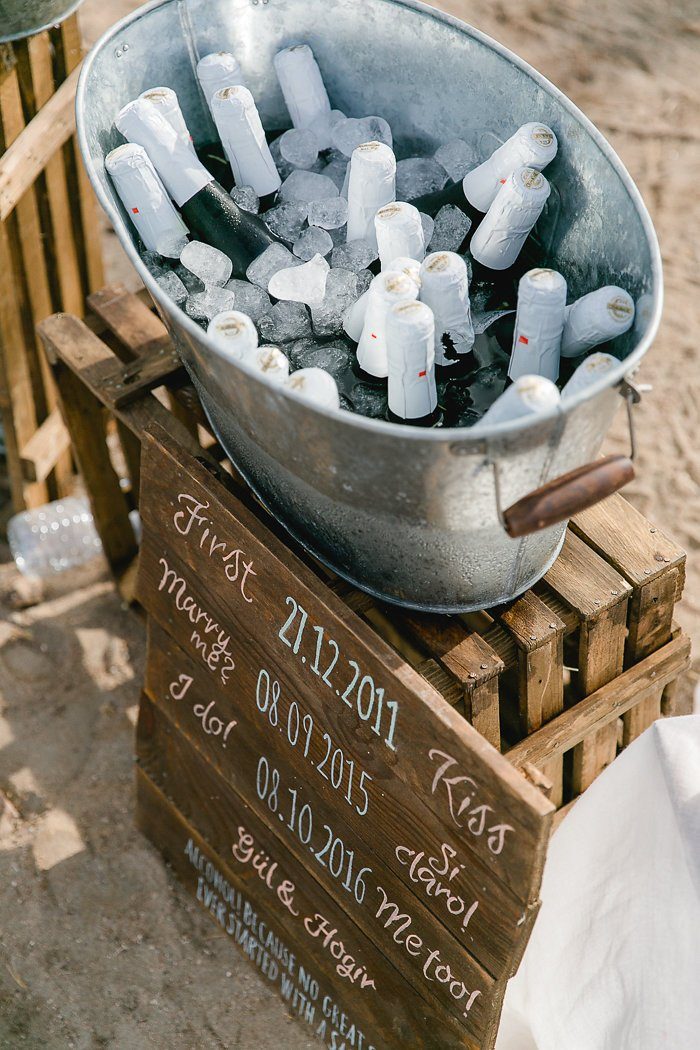 Der Baldachin aus weißen Leinentüchern mit üppigen Blütenschmuck bot einen optischen Rahmen bei der Zeremonie und fügte sich entspannt in die restliche Deko ein. Klar, dass bei warmen Temperaturen kühle Getränke gerne angenommen werden. In einem Bottich mit Eis warteten gekühlte Erfrischungen auf die Gäste.