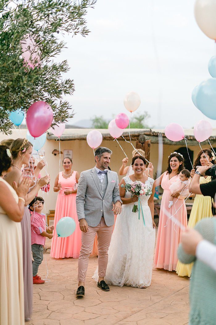 Nach dem Paarshooting in der tief stehenden Sonne kehrte das frisch vermählte Paar zu seinen Gästen zurück und wurde mit vielen bunten Luftballons empfangen, die anschließend steigen gelassen wurden. Ein Hochzeitsklassiker, der aber einfach immer wieder schön wirkt und begeisterte Blicke erzeugt.