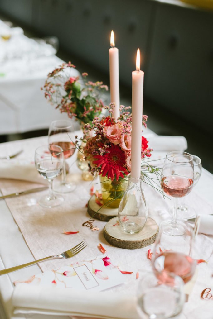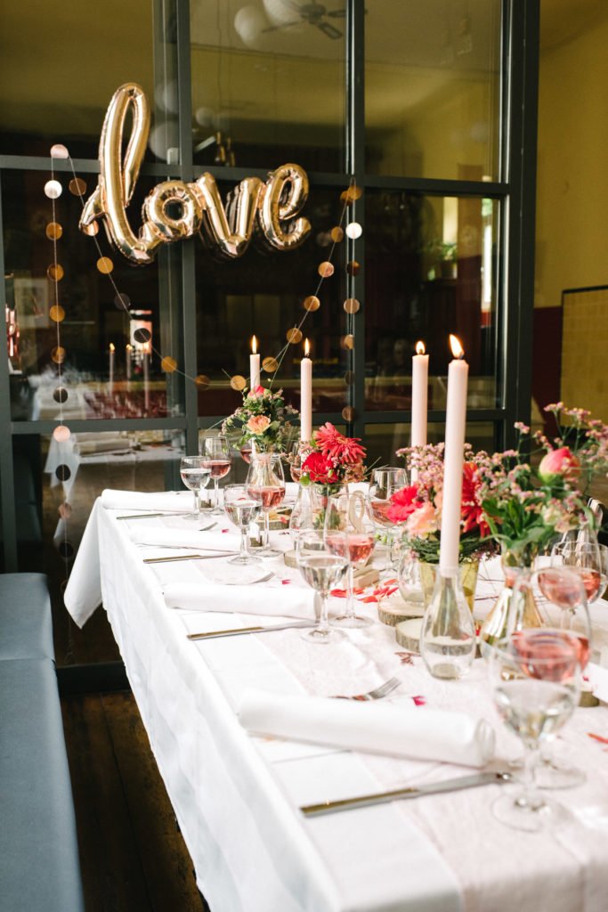 Lange Stabkerzen in Rosa erzeugen eine stimmungsvolle Atmosphäre. Bauchige Glasvasen wurden hier als Kerzenhalter umfunktioniert. Kleine love Schriftzüge in Roségold werden auf den Tischen verteilt und sorgen für hübsche Hingucker.