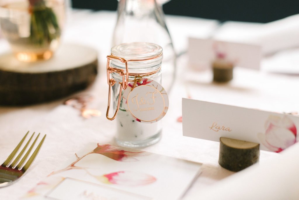 Ebenfalls aus Holz: die Tischnummern. Wer mag, kann diese sogar farbig ansprühen! Funktioniert wunderbar und schimmert dann ebenfalls in roségold.