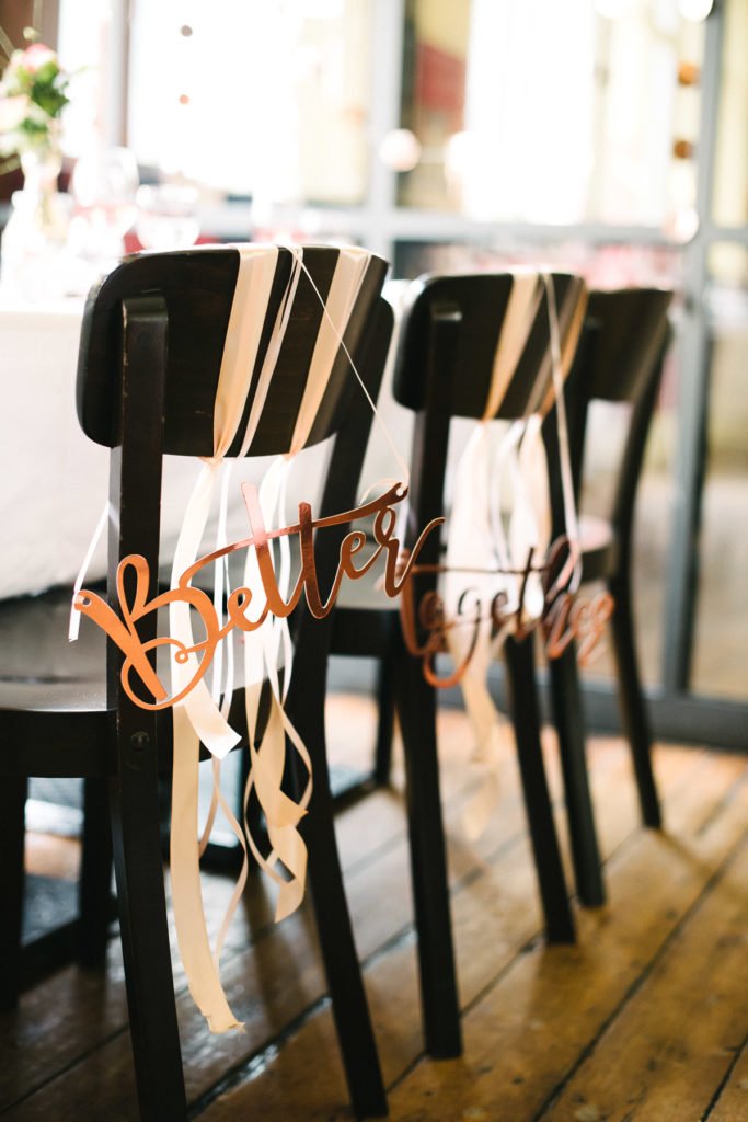 Der Platz des Brautpaars wird besonders geschmückt: lange Satinbänder umschlingen die Lehne und ein ‘Better together Banner’ baumelt lässig an den Stühlen.