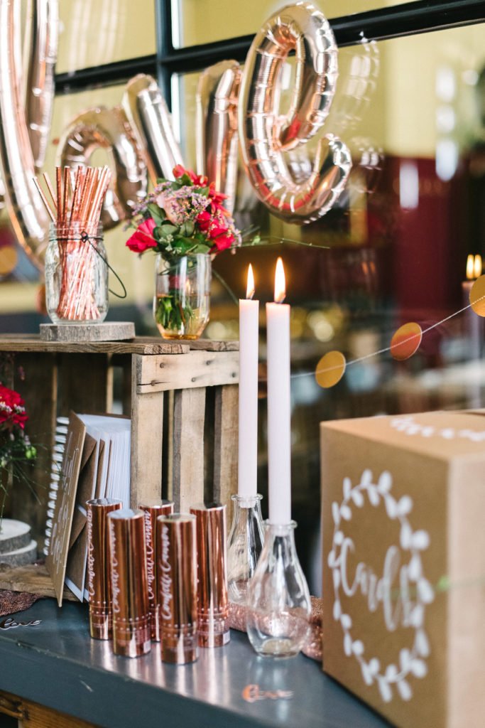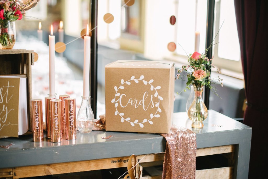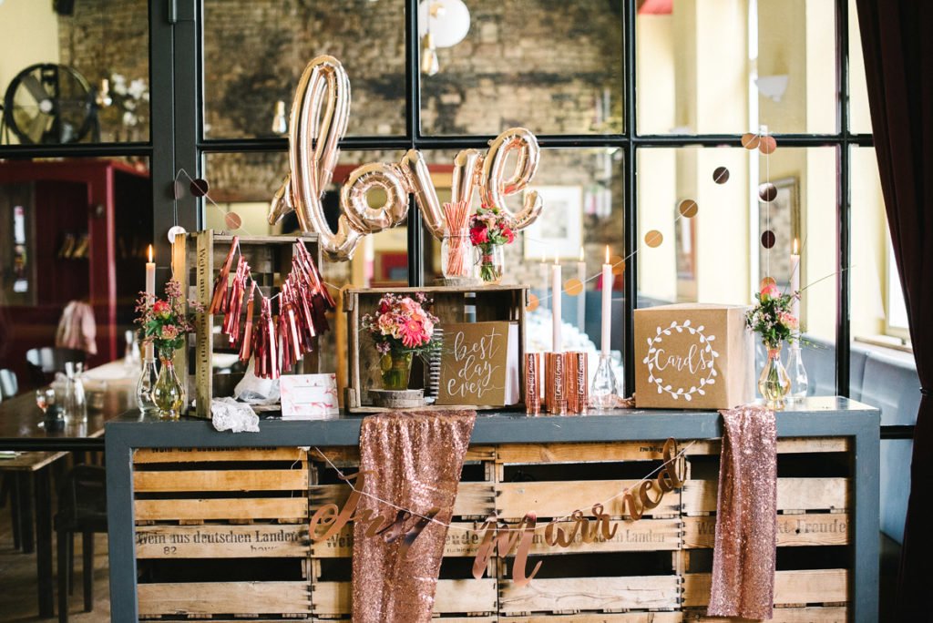 An bestimmten Stationen in der Location könnt Ihr Euch dann so richtig austoben: Candybar, Geschenketisch, Kuchenbuffet oder der Bar. Sorgt auch hier für entsprechende Hingucker! Mit Luftballons, z.B. einem roségoldenen Love Ballon, einem Lamettavorhang in Roségold oder einer Tasselgirlande setzt Ihr funkelnde Akzente in Eurer Hochzeitsdekoration.