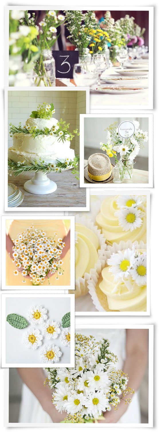 1) Lockere Tischdeko mit kleinen Sträußchen 2) Eine Hochzeitstorte mit kleinen Gänseblümchen 3) Hübsch im Gläschen arrangierte Gänseblümchen 4) Mehr geht nicht: ein Brautstrauß aus Gänseblümchen 5) Muffins mit Zitronencreme und – klar – Gänseblümchendeko 6) Sehr süß: Häkelgänseblümchen mit kleinen Blättern 7) Und noch ein üppiger Brautstrauß mit Gänseblümchen und Margariten