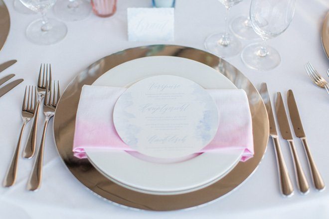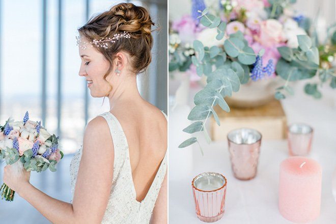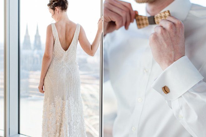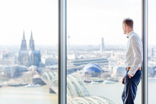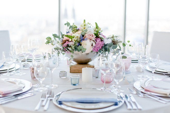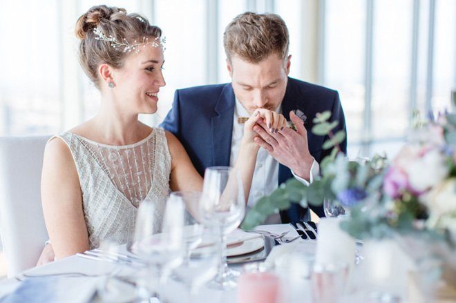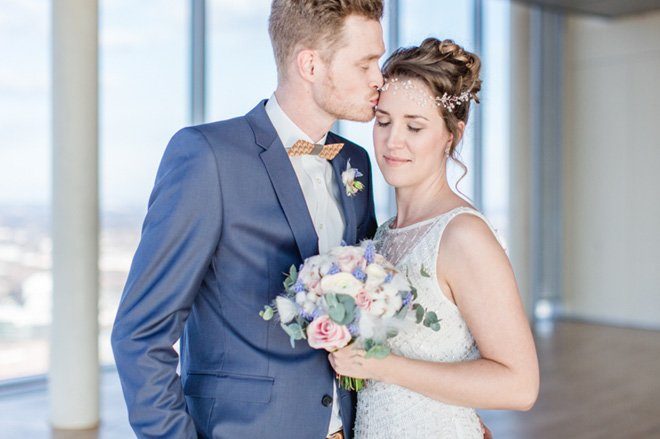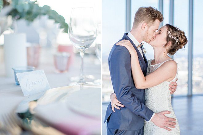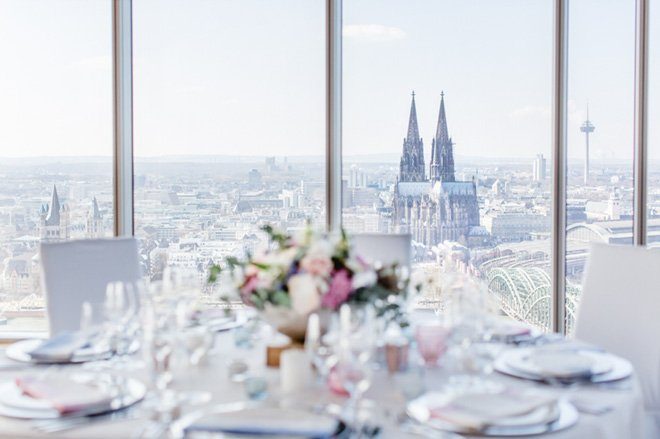 Tolle Dienstleister haben zugesagt und so ist aus der Idee ein wahrer Augenschmaus geworden: Modern, elegant und mit einem Touch Glamour. Die beiden Trendfarben 2016 von Pantone “Rose Quartz” und “Serenity” passen perfekt dazu und Nicole von Nicnillas Ink hat Farben und Thema zu einer leichten, luftigen Papeterie-Serie zusammengeführt. Die wunderschön schlichte und klare Tischdekoration wird von einem Bukett in sanften Farben gekrönt, lenkt jedoch nicht ab vom eigentlichen Mittelpunkt, der Aussicht von Wolke 7. Und die ist so großartig und weit, dass man meinen könnte, man sei tatsächlich auf einer Wolke hoch oben gelandet. Die Wolke ist in diesem Fall KölnSKY und das ist mit seiner Lage im 28. Stock den Himmel wirklich sehr nah. Wer dem Himmel auch bei der standesamtlichen oder der freien Trauung schon nah sein möchte, hat hier sogar die Möglichkeit dazu.