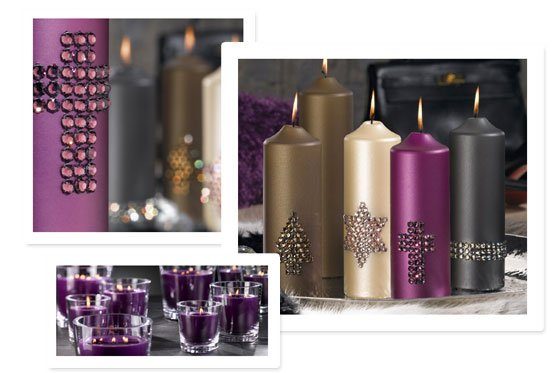 Meine Damen, es gibt Alternativen! Diese schicken, modernen Hochzeitskerzen von Engels Kerzen zum Beispiel. Also so ne lila Kerzen mit Strasssteinen hat doch was… macht auch auf dem Tisch was her und farblich passend gibts kleine Kerzen in massiven Glasvasen.