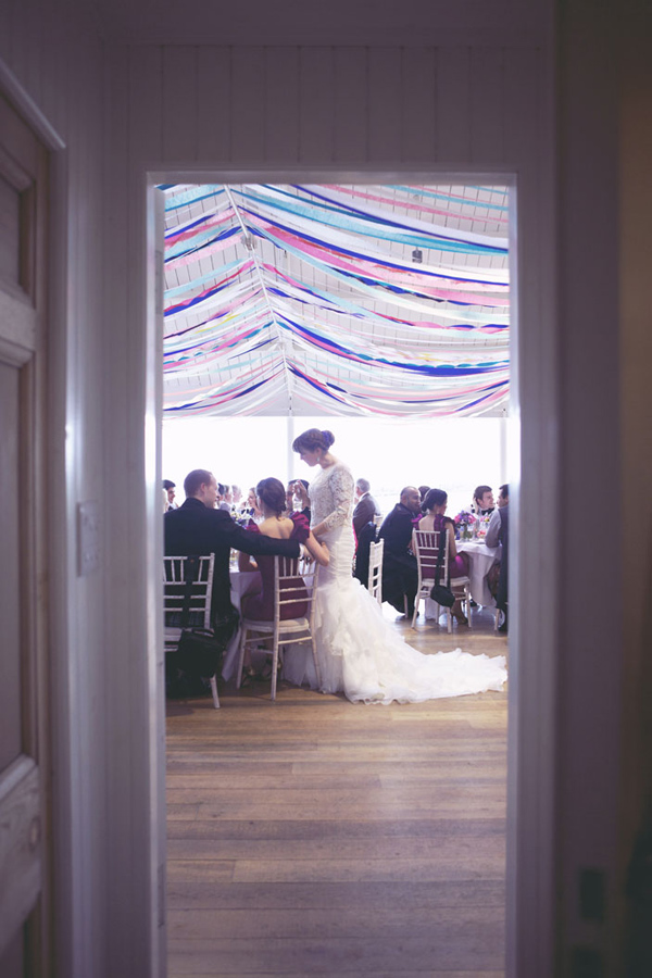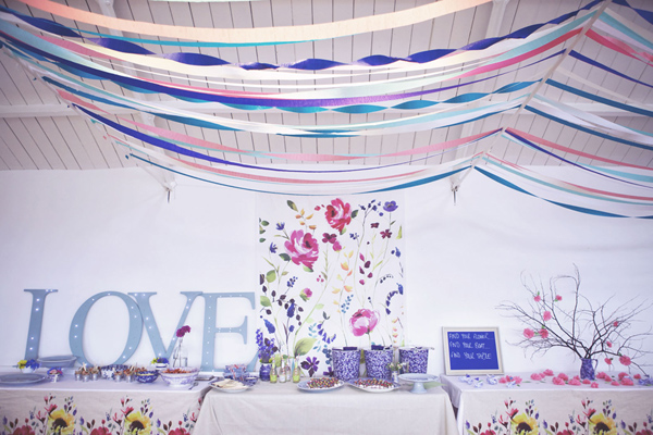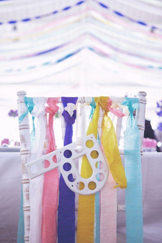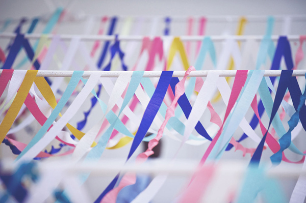 Deko muss her. Viel. Und bitte bezahlbar. Eine mögliche Lösung: bunte Kreppbänder. An Stuhllehnen gebunden schwingen fröhlich sie bei jeden Luftzug, herunterhängend an hohen Stangen säumen sie den Weg und unter der Decke gespannt sorgen sie für eine schicke Gemütlichkeit. Zum Glück gibt’s die auch in allen möglichen Farben, so dass sicher auch Eure Hochzeitsfarben zu finden sind. Kann man bei Amazon bestellen oder hier und hier.