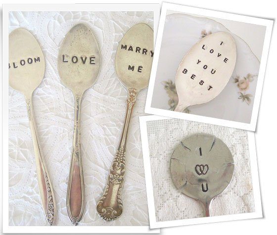 Nein, nicht “message in abottle”, sondern Botschaft auf dem Löffelchen. Diese Löffel sieht man momentan überall: platt gewalzt und mit einer kleinen Liebesbotschaft geprägt. Man kann ja auch ne Menge netter Sachen damit anstellen: Geschenke aufpeppen, Tischdekorationen den gewissen Chick geben, man könnte sie sogar in den Brautstrauß einbinden oder in die Anstecknadel des Bräutigams…