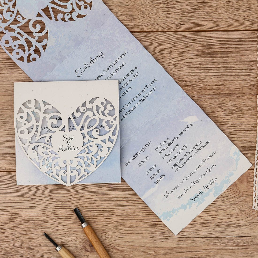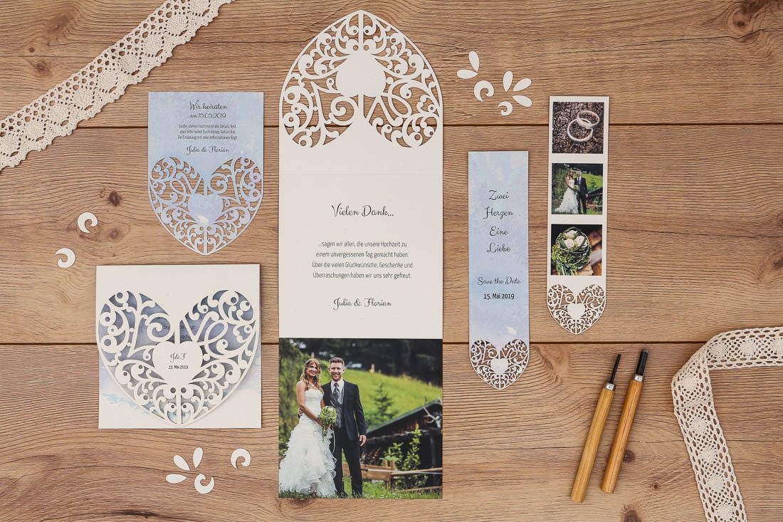 Herzkarten steht nämlich nicht nur für tolle Designs, sondern auch für besondere Veredlungstechniken. Allen voran der Lasercut, der es ermöglicht Karten mit sehr filigranen und einzigartigen Mustern herzustellen, die aus dem Papier geschnitten sind. Ein Laser arbeitet dabei präzise die feinen Linien ab und gibt zum Beispiel der Einladungskarte einen hochwertigen und edlen Look. Bei festerem Papier kann der Laser sogar feine Schichten abtragen und erzeugt damit den Eindruck einer Gravur.