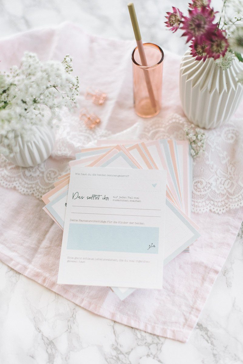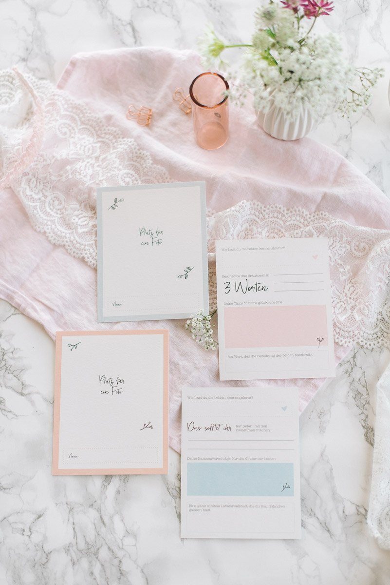 Auf der Vorderseite ist Platz für ein Foto und die Namen der abgebildeten Gäste. Die Rückseite ist für Botschaften oder Glückwünsche an das Brautpaar vorgesehen. Damit niemand in Verlegenheit gerät nicht zu wissen, was er schreiben soll, gibt es Felder, die ausgefüllt werden. Wie könnten die Kinder des Paares heißen, was sollten die beiden unbedingt mal zusammen ausprobieren? Oder wie lauten die drei Worte, die das Brautpaar aus Sicht des Gastes am besten beschreiben?