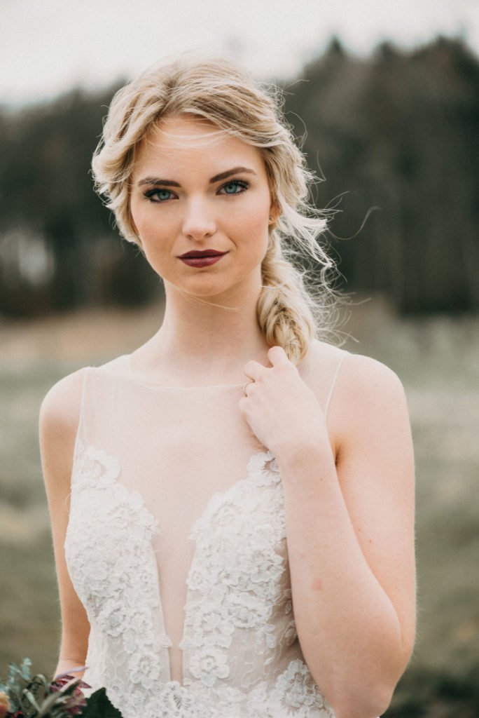 Das Styling unterstreicht diesen Look: die lange Haare werden in sanften Wellen tief am Hinterkopf zusammen geschlungen und in einem sehr lässig gebundenen Zopf fortgeführt. Das Make-up darf ein wenig auffälliger sein. Die dunklen Lippen passen hervorragend zum Brautstrauß. Ein ausdrucksstarkes Augenmake-up ist der perfekte Gegenspieler.