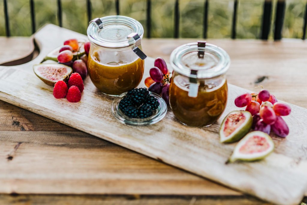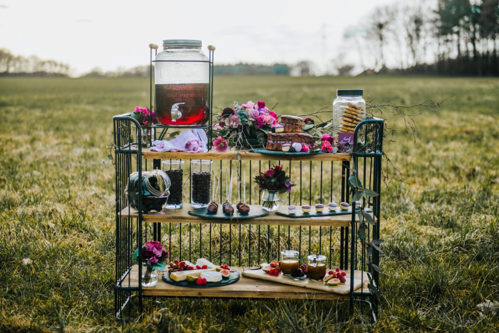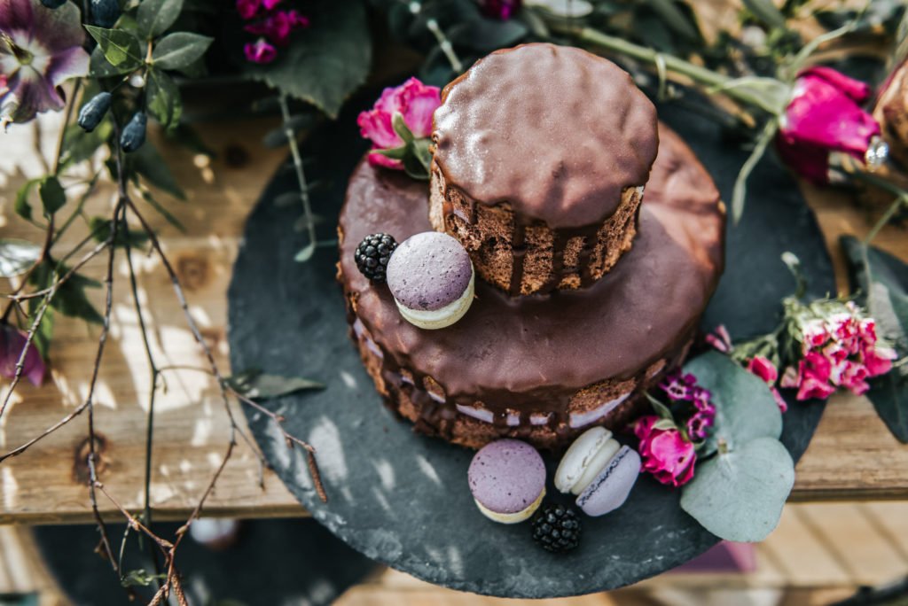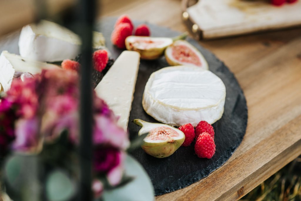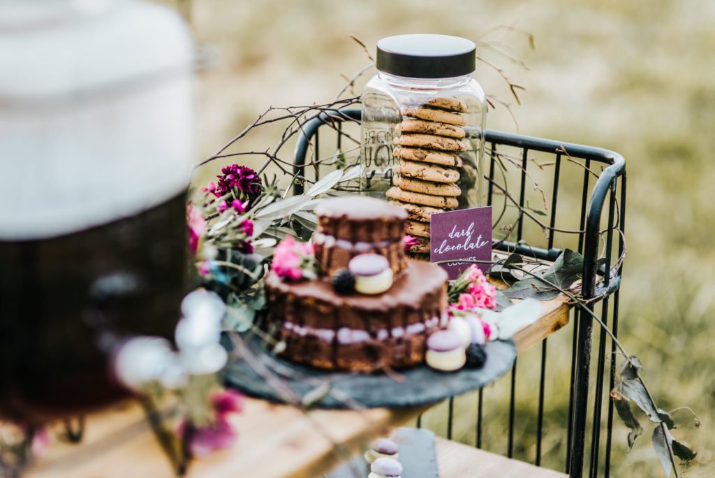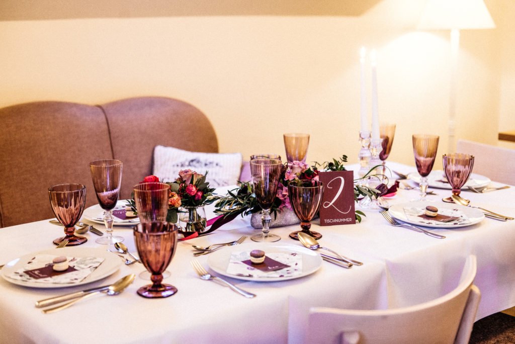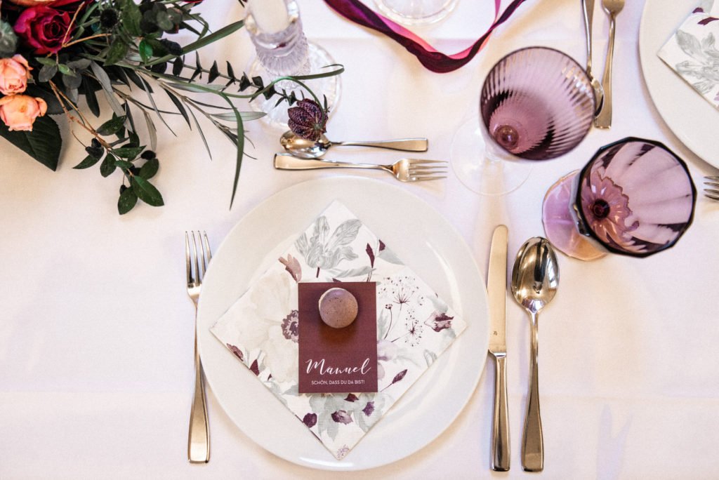 Das satte Farbkonzept in warmen Beerentönen setzt sich in der Tischdekoration und dem Dessert fort. Hättet Ihr gedacht, dass Schokoladen- und Brombeertöne so gut miteinander aussehen? Da möchte man glatt reinbeißen! Hier kommen übrigens auch Fans eines nicht süßen Nachtischs auf ihre Kosten: eine feine Auswahl an Käse wurde nämlich ebenfalls angeboten.