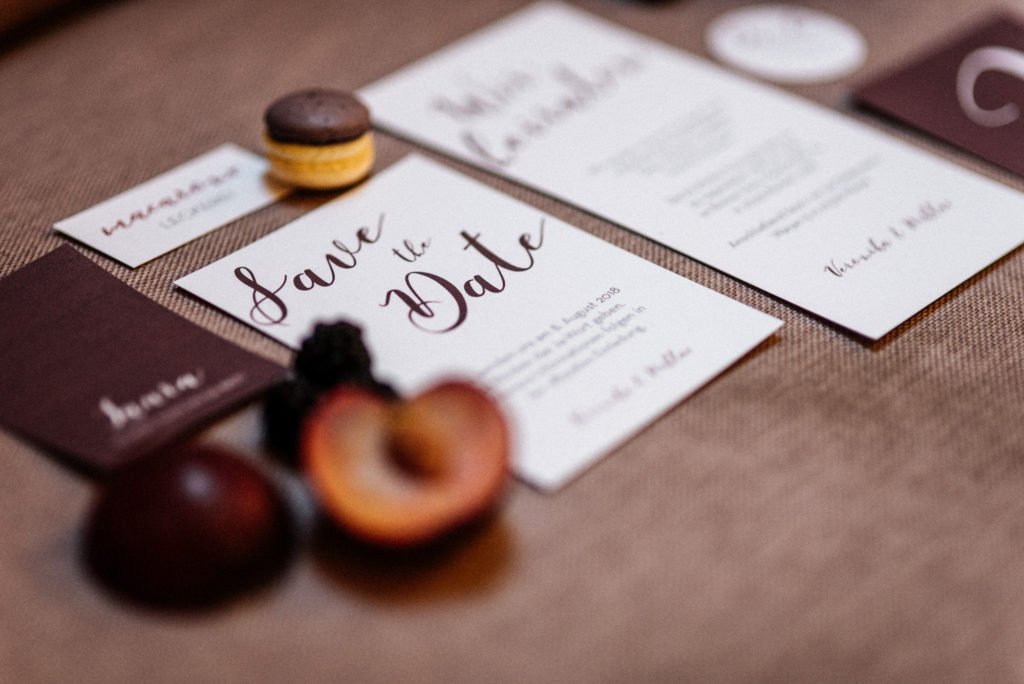 Schokoladig und beerig überrascht auch die Papeterie. Den kräftigen Farben tritt eine leichte Kalligraphieschrift entgegen.