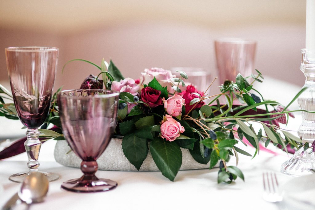 Der lila Faden wird selbstverständlich auch im floralen Tischschmuck und im Brautstrauß weiter gestrickt.
