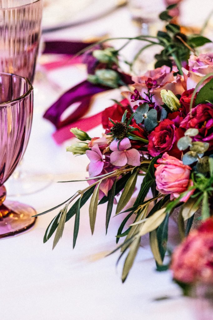 Tischdekoration & Hochzeitstorte in kräftigen Beerenfarben