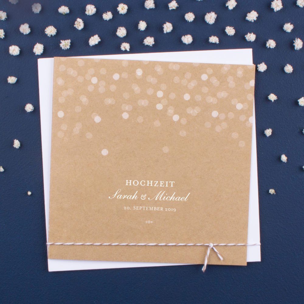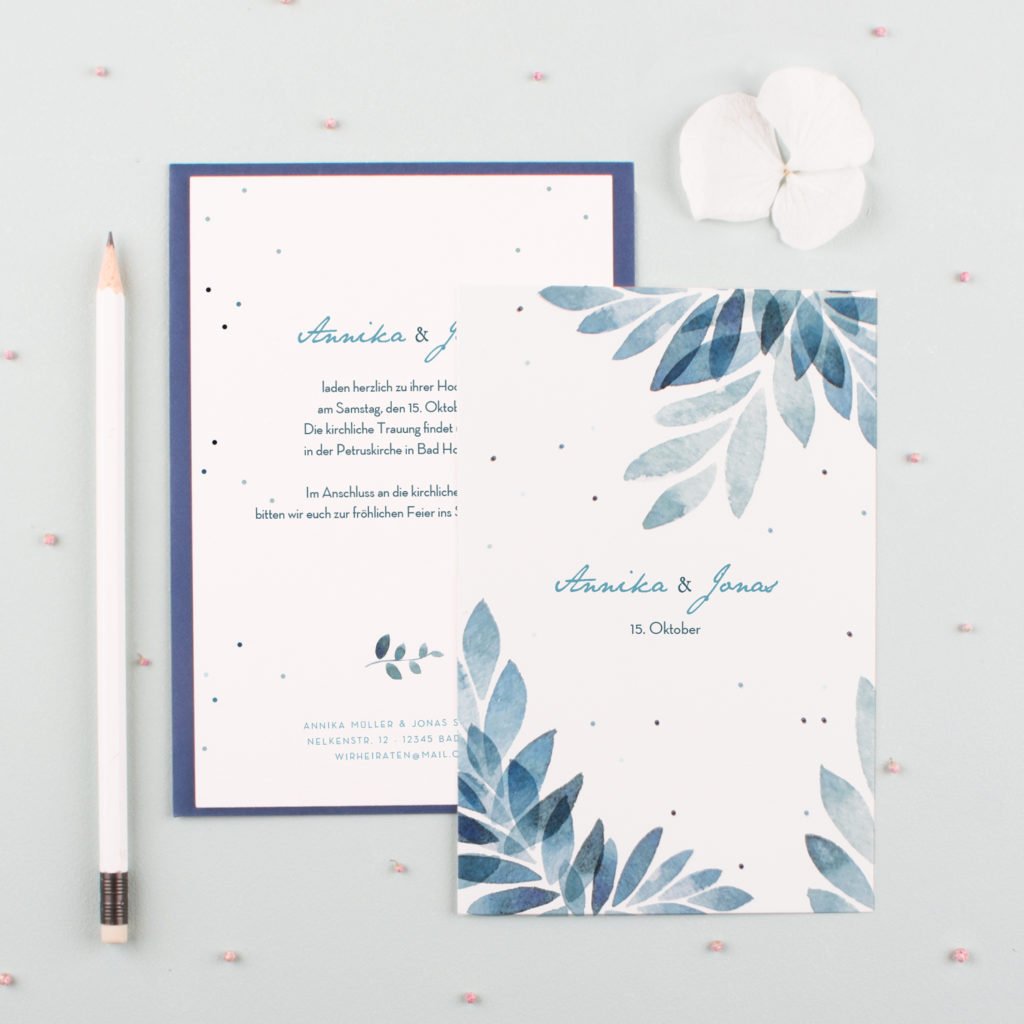 Das Modell Sommernacht ist wie gemacht für eine entspannt schöne Feier bis in die frühen Morgenstunden. Die Pastellfarben der Blätter harmonieren ganz unaufgeregt mit den kleinen Pünktchen und der filigranen Schrift. Die Einladung ist ebenfalls als Klappkarte im quadratischen Format verfügbar. Passende Kuverts werden zu den Karten gratis mitgeliefert.