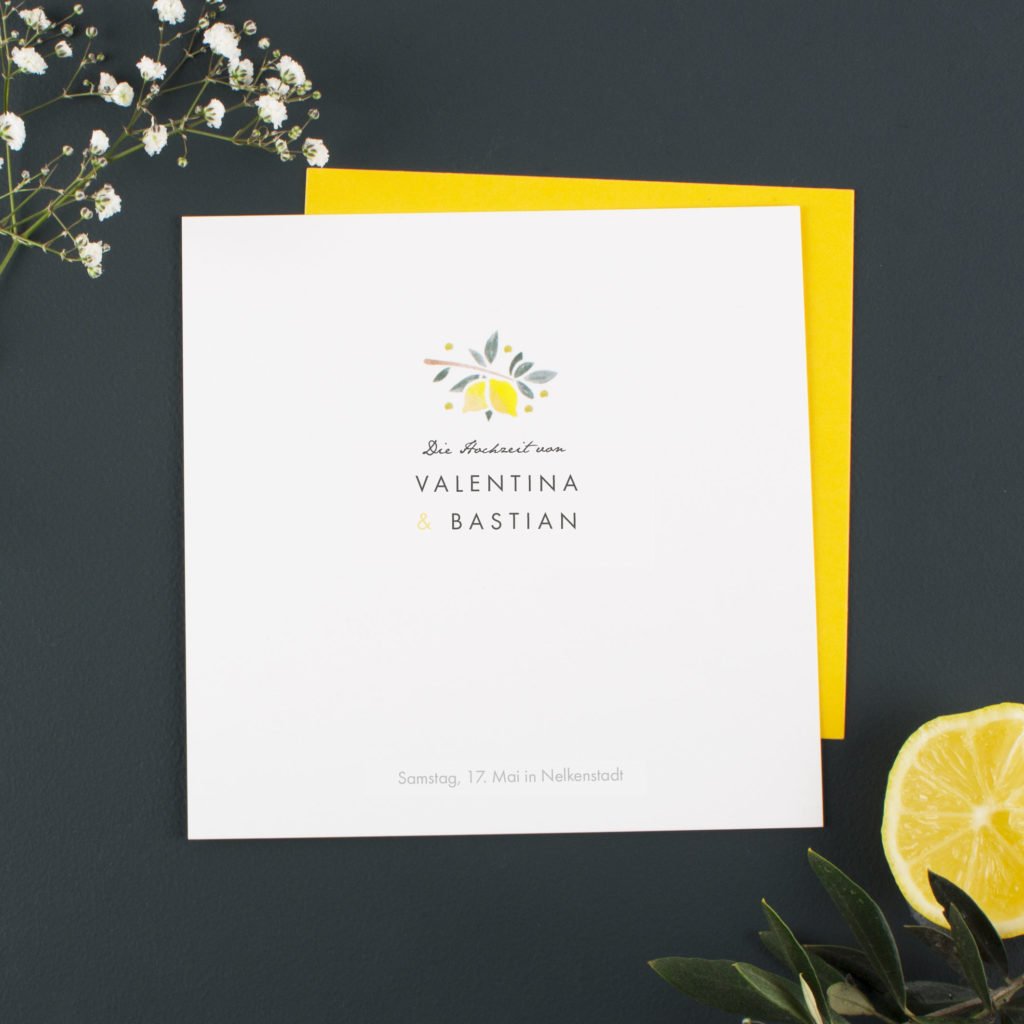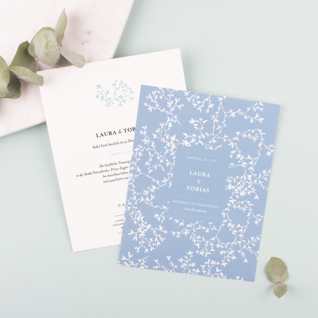 Das Modell Sommernacht ist wie gemacht für eine entspannt schöne Feier bis in die frühen Morgenstunden. Die Pastellfarben der Blätter harmonieren ganz unaufgeregt mit den kleinen Pünktchen und der filigranen Schrift. Die Einladung ist ebenfalls als Klappkarte im quadratischen Format verfügbar. Passende Kuverts werden zu den Karten gratis mitgeliefert.