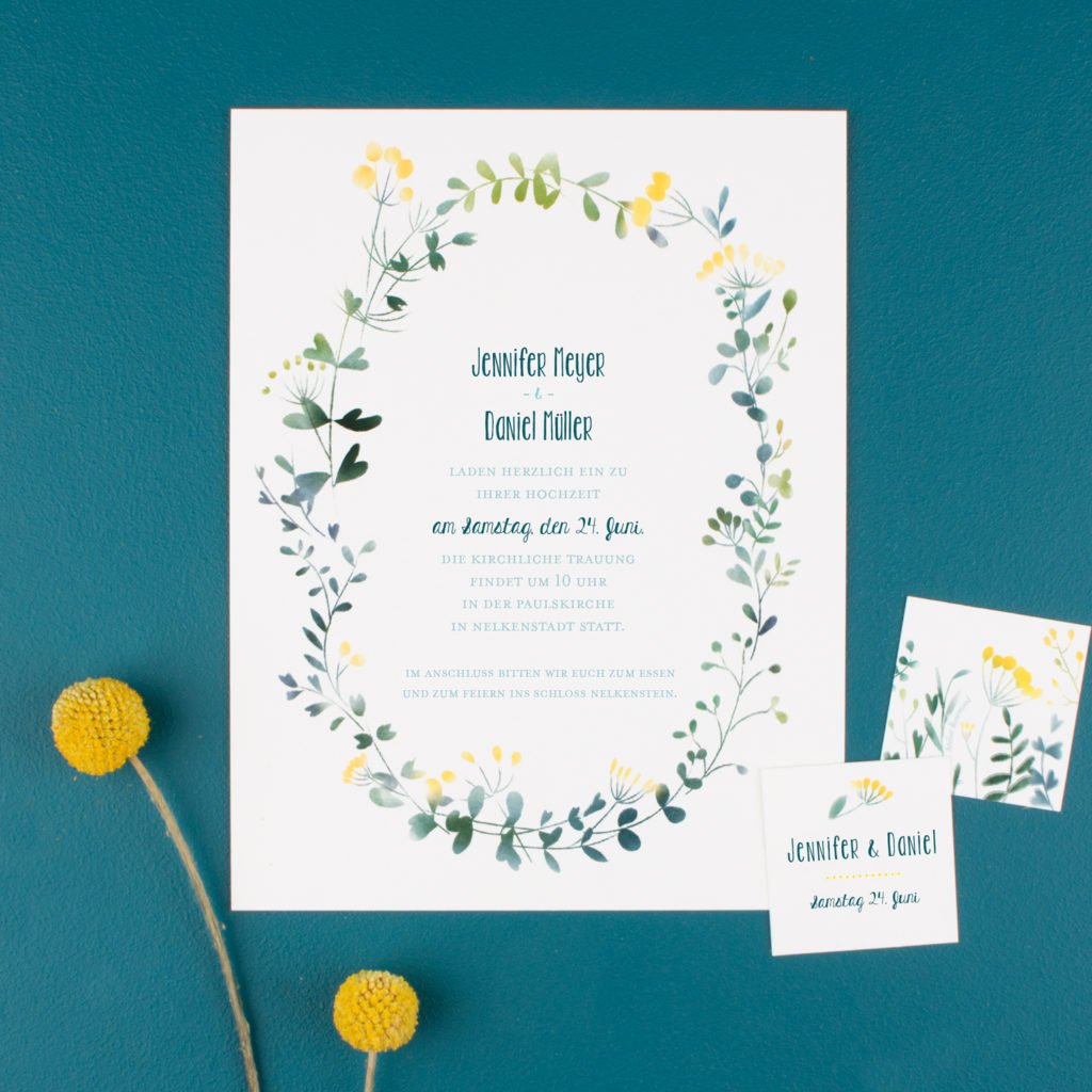 Mit einem filigranen Blütenkranz verzaubert die Serie Wildblumen. Sie ist wie gemacht für Hochzeiten im natürlichen Boho Stil! Der Blütenkranz der Einladung findet sich als florales Muster auf anderen Papeteriebestandteilen wieder und ist in zwei Farbpaletten verfügbar: mit gelben oder rosé Blüten.