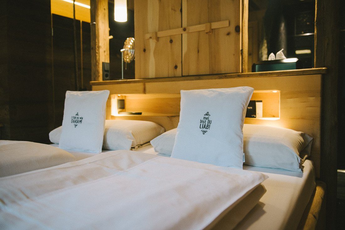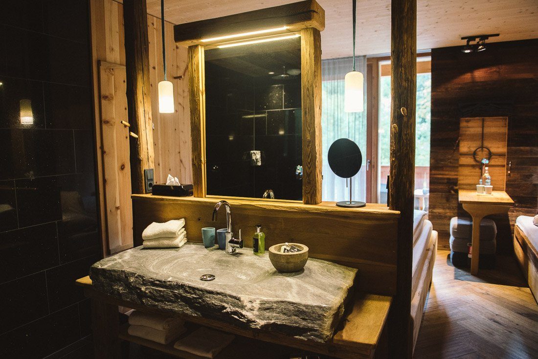 Die Zimmer laden nämlich wirklich zum Verweilen ein. Holz und Schiefer sind haben die Architekten gekonnt kombiniert. Traditionell und dennoch gar nicht langweilig! Ein offenes Bad mit massivem Steinwaschbecken in der Mitte. Dahinter das hervorragende Bett und ein Blick durch die Balkontüre auf die umliegenden Berge. Wenn da die Hauptstraße nicht dazwischen wäre, die ab und an ganz gut befahren ist. Aber hey, Urban Soul meets the Alps lautet der Slogan!