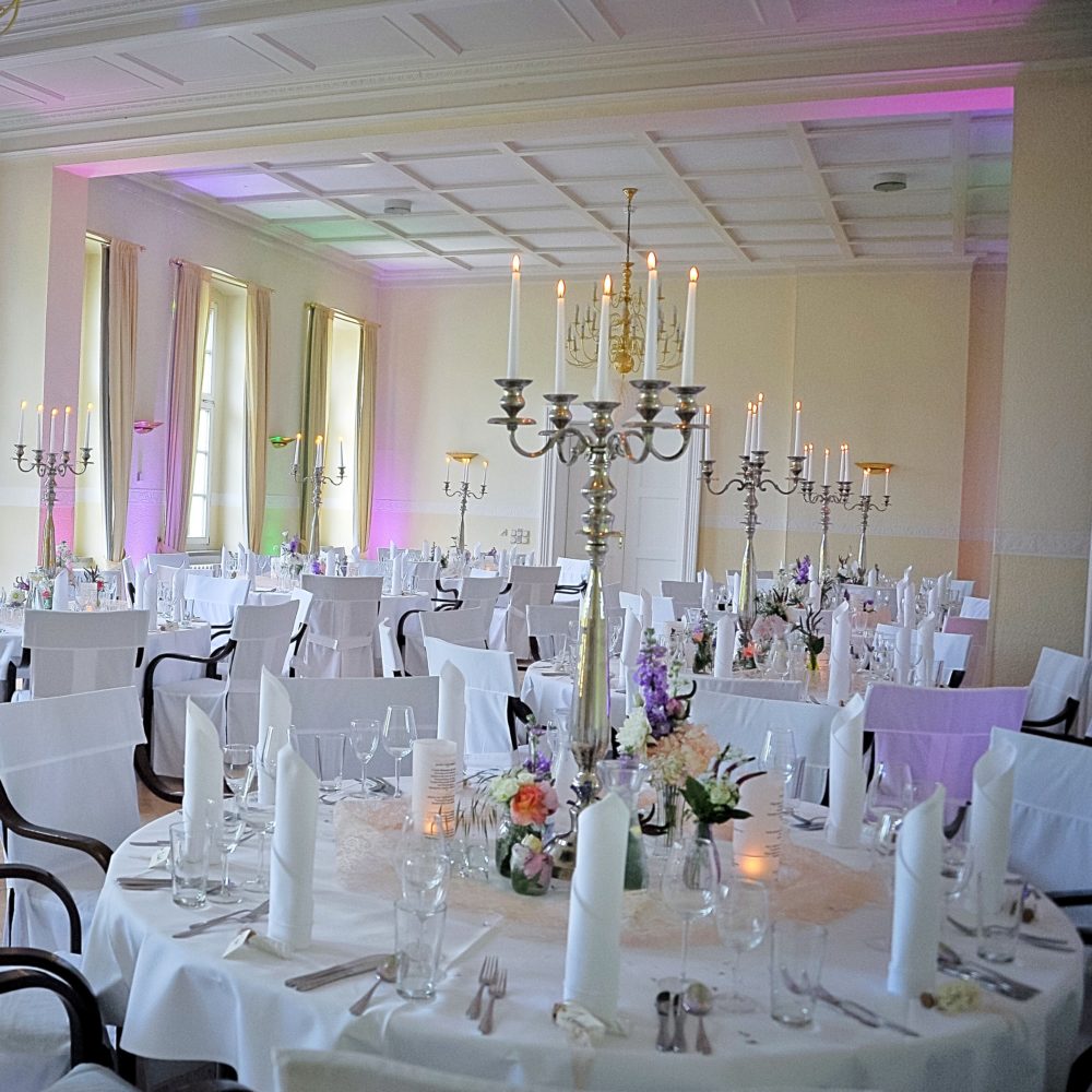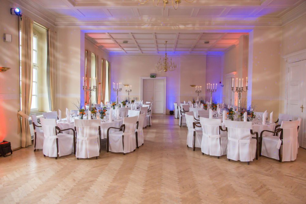 Nach dem Empfang im Garten wechselt Ihr mit Eurer Festgesellschaft in das elegante Ambiente des Bankettsaals und feiert bis in die frühen Morgenstunden.