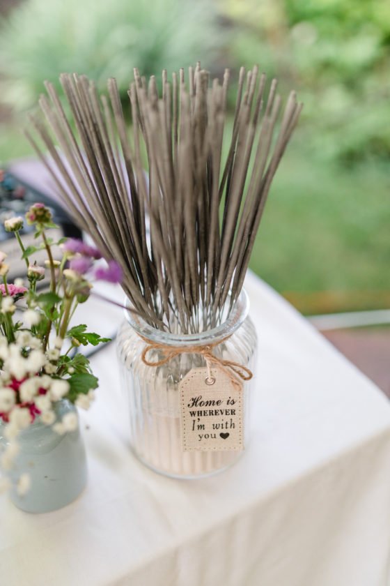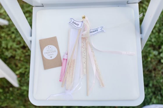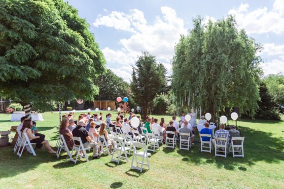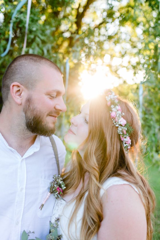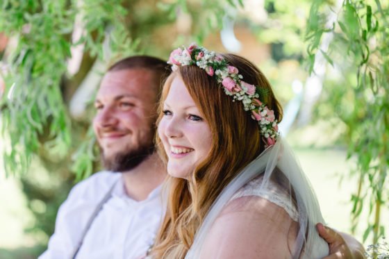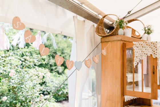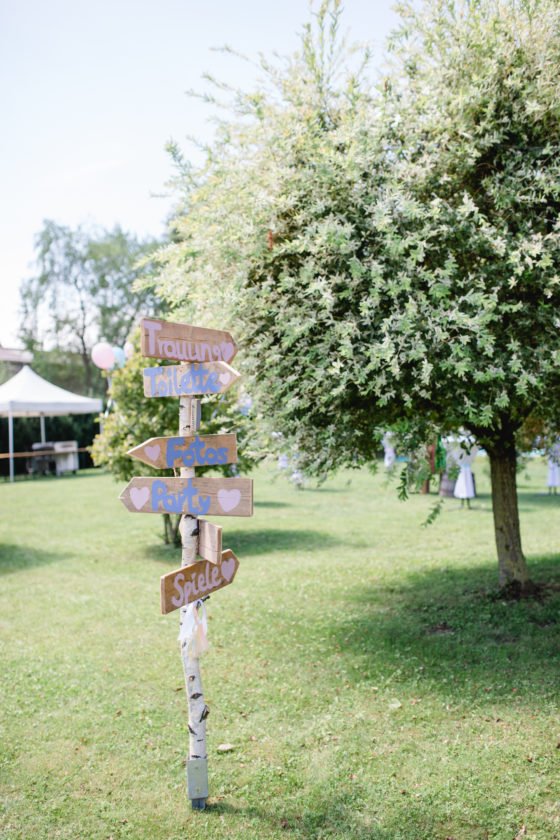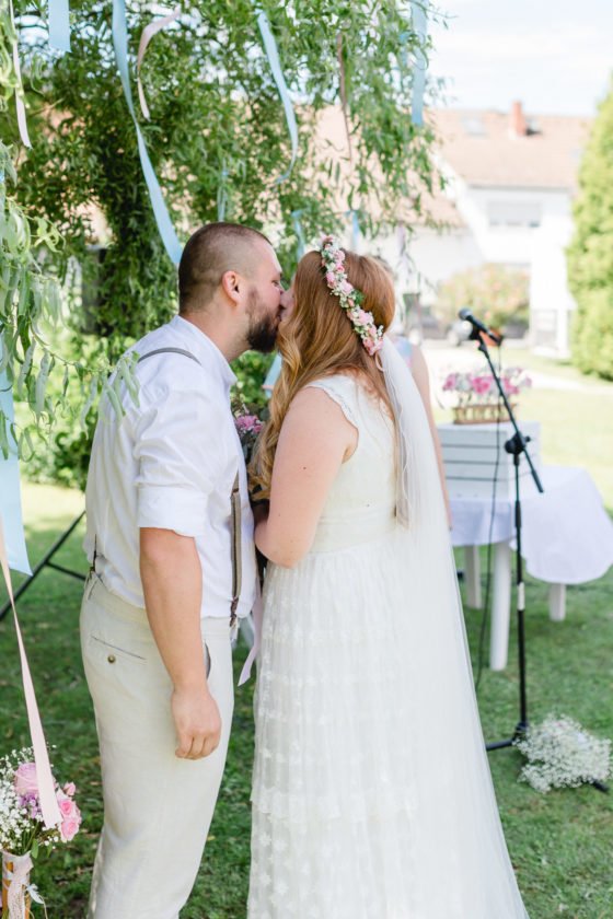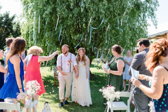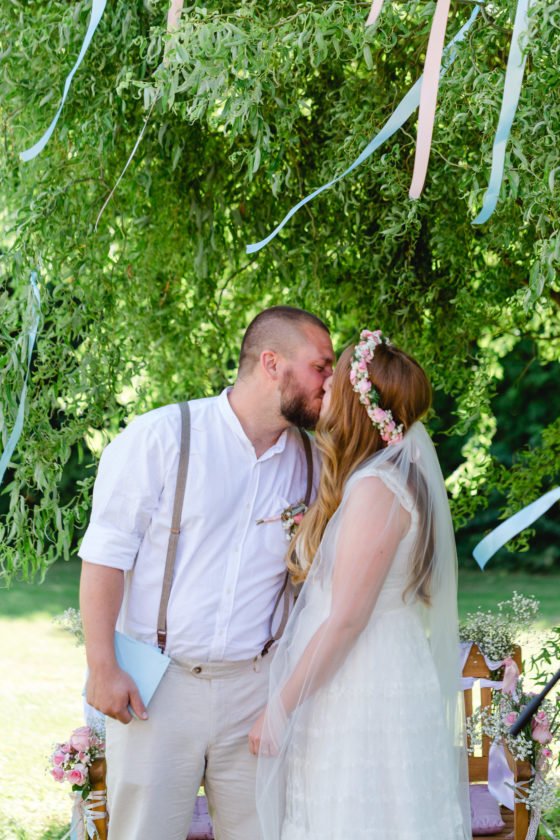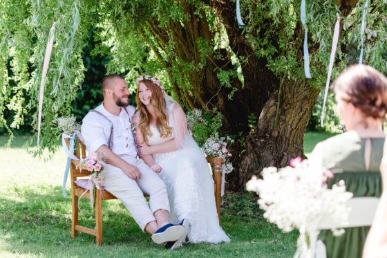 Die Satinbänder flatterten sanft im Baum als die beiden sich das Ja-Wort gaben. Was für eine wunderschöne Atmosphäre die Trauung auf der großen Wiese hatte!