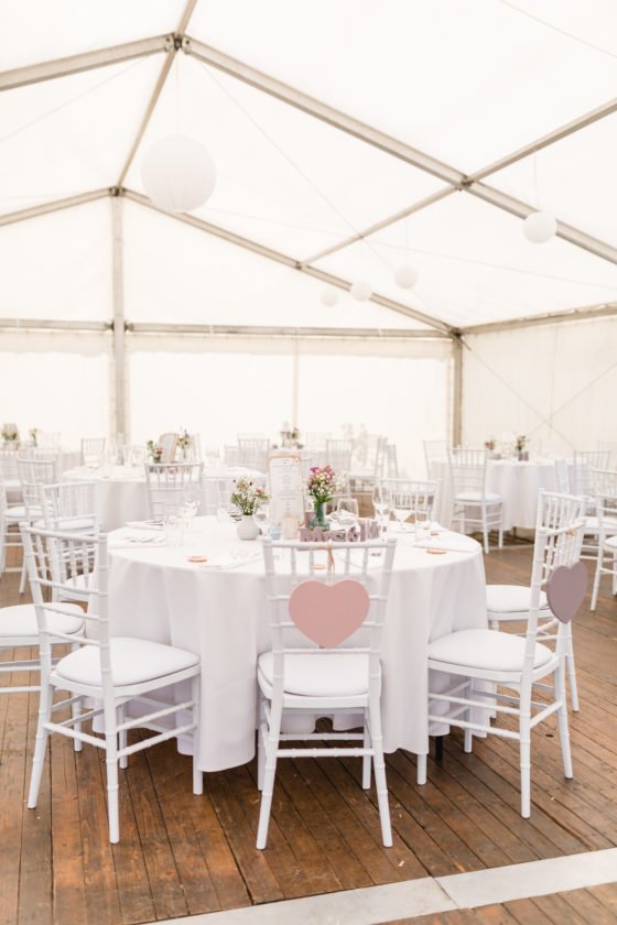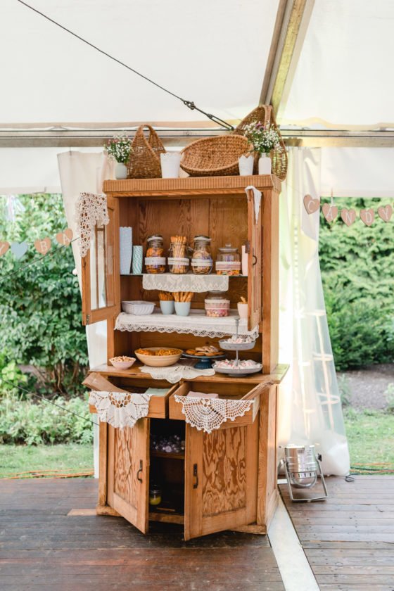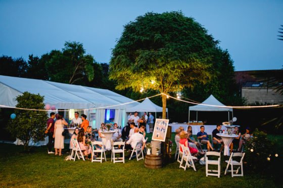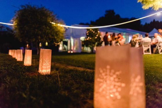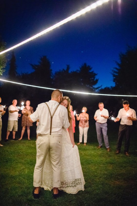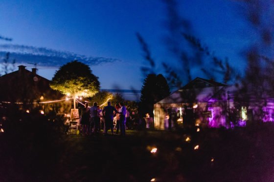 Zum Essen nahm die Gesellschaft im eigens aufgebauten Zelt Platz, fand jedoch schnell wieder den Weg ins Freie, denn wer kann schon einer lauen Sommernacht widerstehen? Nicht mal das Brautpaar beim Hochzeitstanz! Den kann man auch einfach auf der Wiese tanzen. Im Schein der romantischen Lichterketten und Lichttüten… So schön!
