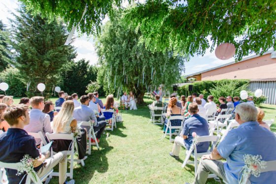 Die Satinbänder flatterten sanft im Baum als die beiden sich das Ja-Wort gaben. Was für eine wunderschöne Atmosphäre die Trauung auf der großen Wiese hatte!