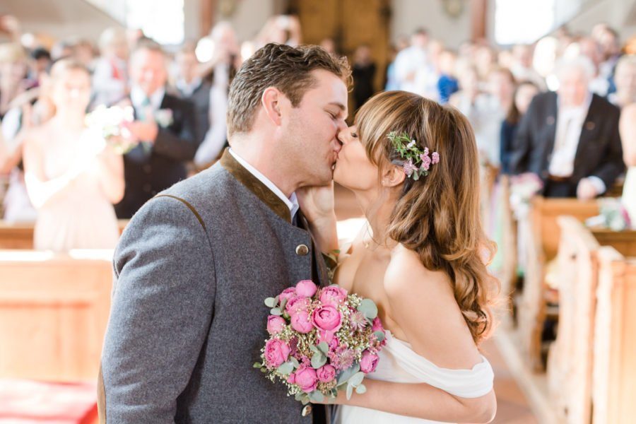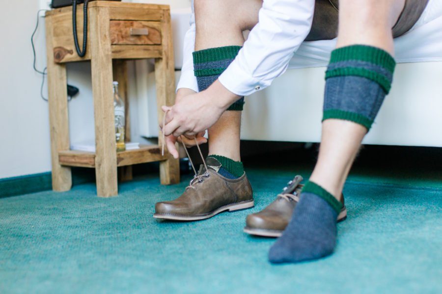 Daniel hat sich für ein zünftiges Trachtenoutfit entschieden mit Krachlederner, Loferl (das sind diese zwei geteilten Strümpfe – Socke und Wadenwärmer) und Judy für eine zauberhafte, schlichte, fließende Kreation mit einer außergewöhnlichen Trägervariante. Dazu das offene Haar mit kleinen Blümchen – so schön! Das Getting Ready fand im Hotel Waidringer Hof statt in zwei nebeneinander liegenden Zimmern. Und wo gab’s diesen überwältigenden Moment des First Look? Auf dem Balkon, der beide Zimmer verbindet! Danach konnte das Brautpaar dann auch gleich gemeinsam königlich vom Balkon winken…