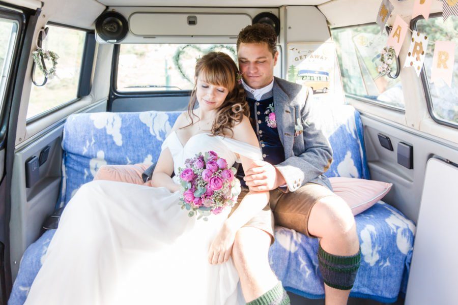Bevor die beiden in der üppigen katholischen Kirche in Waidring getraut wurden, blieb noch Zeit für gefühlvolle Fotos von Judy und Daniel vor traumhafter Kulisse und mit einem kleinen Star in der Nebenrolle: Ein stylischer VW-Bus, hochzeitlich geschmückt, durfte auf einige Fotos mit drauf. Nach der Trauung ging’s rauf zur Alm – wo auf die begeisterten Gäste nicht nur neugierige Kühe, sondern ein feines Kuchenbuffet wartete. Das gab’s draußen auf der weitläufigen Terrasse, das Abendessen wurde drinnen, in der holzvertäfelten Stube serviert. Für die hatten mit viel Liebe zum Detail die Braut Judy und Ihrer Schwestern eine zauberhafte Deko zusammengestellt und einige DIY Projekte dafür umgesetzt, darunter sogar für jedes Kind eine extra Überraschungstüte. Schaut ganz genau hin! Und was wäre solch ein Fest ohne zünftige Musik? Eben. Sogar zu Kaffee und Kuchen kam schon die Musi’ und es wurde getanzt und geklatscht zum Schuhplattler. Am Abend ging es schwungvoll und mit guter Stimmung weiter. Und als die Sonne schon tief stand nahmen sich Judy und Daniel noch einen ruhigen Moment bei dieser verzauberten Abendstimmung am Berg und es entstanden noch ein paar gefühlvolle Portraits. Einfach eine Wucht, diese Almhochzeit – schaut’s Euch an!