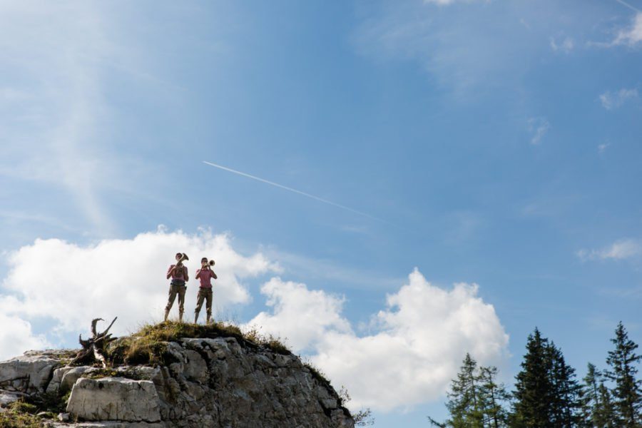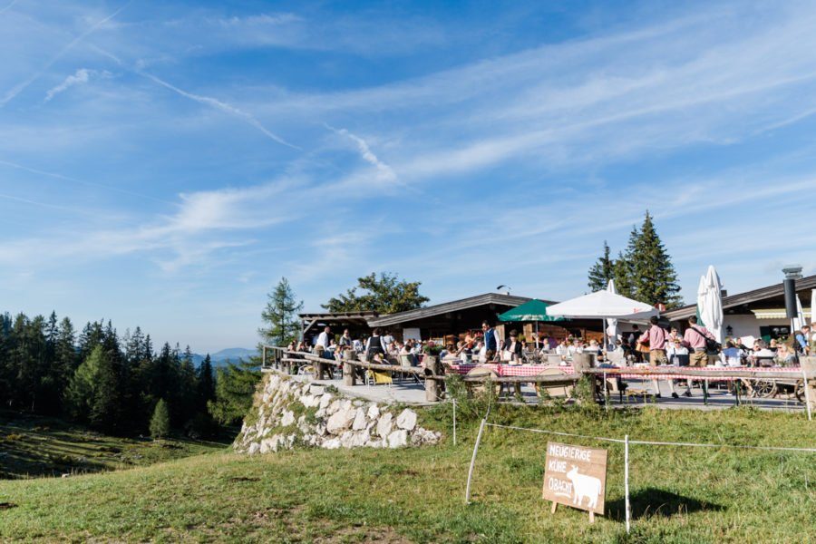 Auf der Alm, da gibt’s koa Sünd! Aber a pfundige Hochzeit – die gibt’s da! In diesem Fall sprechen wir von Tirol, genauer den Chiemgauer Alpen. Dort auf der Steinplatte liegt die Stallenalm auf 1.400 m. Allein die Hammeraussicht ist ein Grund, da zu feiern! Judy und Daniel jedenfalls sind auf die großartige Idee gekommen, Ihre Gäste dorthin zur Hochzeit einzuladen. Sie hatten wohl auch einen besonderen Draht nach oben zum Wettergott, denn wie sonst ist dieser blaue Himmel mit den fotogenen Schleierwölkchen pünktlich zum Tag der Hochzeit zu erklären?