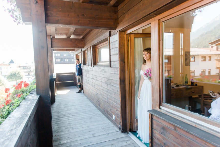 Daniel hat sich für ein zünftiges Trachtenoutfit entschieden mit Krachlederner, Loferl (das sind diese zwei geteilten Strümpfe – Socke und Wadenwärmer) und Judy für eine zauberhafte, schlichte, fließende Kreation mit einer außergewöhnlichen Trägervariante. Dazu das offene Haar mit kleinen Blümchen – so schön! Das Getting Ready fand im Hotel Waidringer Hof statt in zwei nebeneinander liegenden Zimmern. Und wo gab’s diesen überwältigenden Moment des First Look? Auf dem Balkon, der beide Zimmer verbindet! Danach konnte das Brautpaar dann auch gleich gemeinsam königlich vom Balkon winken…