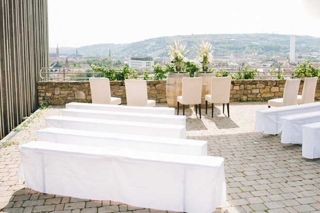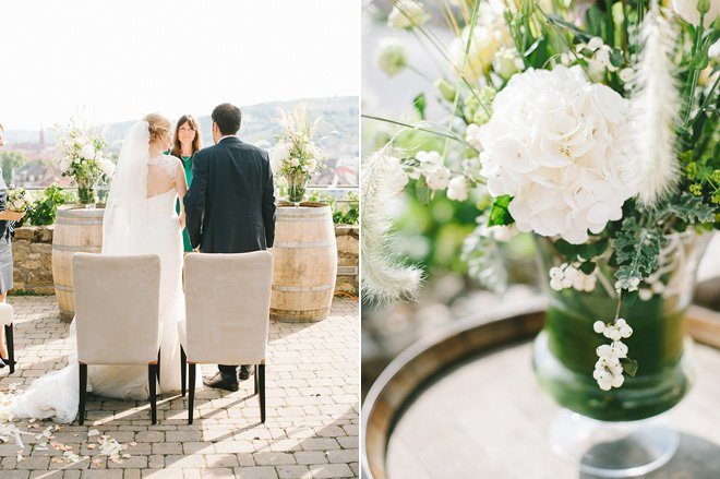 Auch Stefanie und Christian haben schnell Gefallen an dem Gedanken Ihre Hochzeit in einem Weingut bei Würzburg zu feiern, gefunden. An einem herrlichen Sommertag gaben sie sich das Ja-Wort im Freien des Gutes. Zwei antike Weinfässer dienten als Trautisch und der Blick auf die Stadt und ins Rebenmeer war das schönste ‘Altarbild’, das man sich vorstellen konnte. Trauben und hölzerne Elemente wurden in der Demo und den Details wieder aufgegriffen und schufen einen direkten Bezug zur Umgebung. Eine fröhlich, festliche Stimmung entstand in dieser authentisch, festlichen Location.