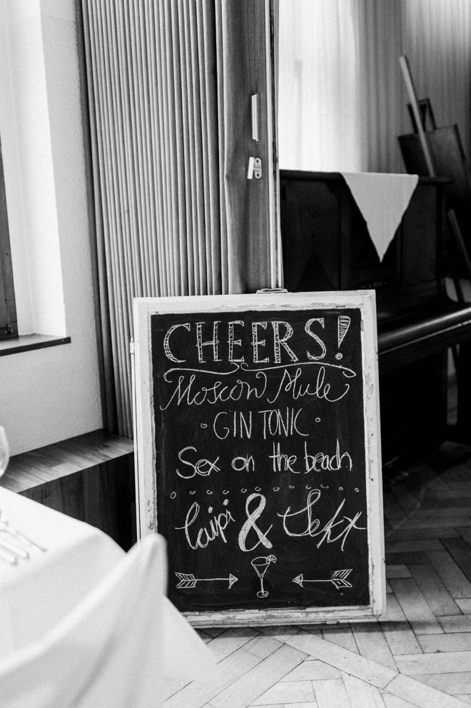 Dass es für ein tolles Fest kein riesen Budget braucht, das zeigen wir Euch immer wieder, und auch die Hochzeit von Anne und Lukas reiht sich in diese Sammlung ein. Die Location, für die sich die beiden entschieden haben, ist einfach der Hit: Der große Saal eines Landgasthofs. Ein klassischer Saal mit tollem, altem Parkettboden, Holzvertäfelung, schönem Gebälk und in zurückhaltender Optik. Hier wurden bestimmt schon viele Jahrzehnte Familienfeste gefeiert, auf der Bühne haben Laienspielgruppen und Musikvereine ihr Bestes gegeben und immer gab es bodenständiges, ehrliches und vor allem sehr leckeres Essen. So lässt sich einfach richtig gut feiern! Und richtig toll dekorieren! Schaut Euch an, was die beiden aus dem Saal gezaubert haben: Romantische Lichterketten, weiße Wimpelketten und überall liebevolle Blumenarrangements mit viel grün, im Kalligraphie-Trend beschriftete Tafeln und dazu ein großer Kranz als zentraler Blickfang an der Wand – ‘Real Love’.