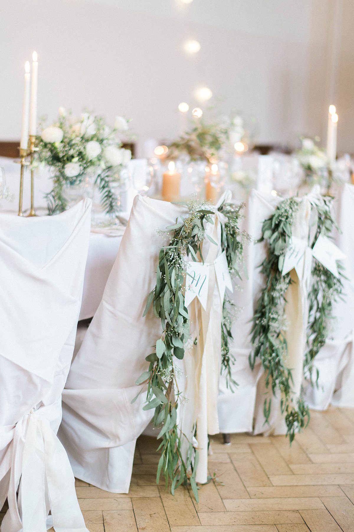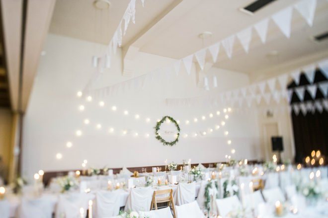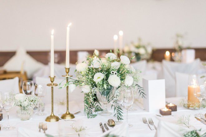 Dass es für ein tolles Fest kein riesen Budget braucht, das zeigen wir Euch immer wieder, und auch die Hochzeit von Anne und Lukas reiht sich in diese Sammlung ein. Die Location, für die sich die beiden entschieden haben, ist einfach der Hit: Der große Saal eines Landgasthofs. Ein klassischer Saal mit tollem, altem Parkettboden, Holzvertäfelung, schönem Gebälk und in zurückhaltender Optik. Hier wurden bestimmt schon viele Jahrzehnte Familienfeste gefeiert, auf der Bühne haben Laienspielgruppen und Musikvereine ihr Bestes gegeben und immer gab es bodenständiges, ehrliches und vor allem sehr leckeres Essen. So lässt sich einfach richtig gut feiern! Und richtig toll dekorieren! Schaut Euch an, was die beiden aus dem Saal gezaubert haben: Romantische Lichterketten, weiße Wimpelketten und überall liebevolle Blumenarrangements mit viel grün, im Kalligraphie-Trend beschriftete Tafeln und dazu ein großer Kranz als zentraler Blickfang an der Wand – ‘Real Love’.