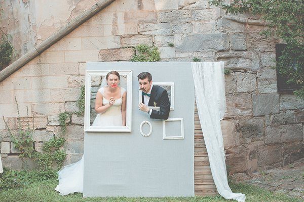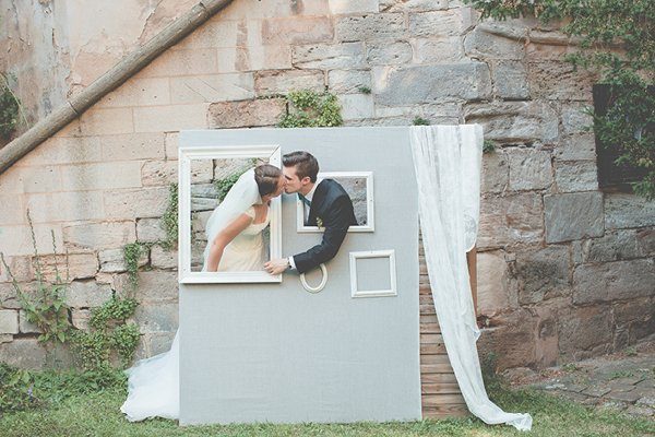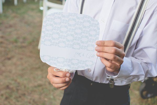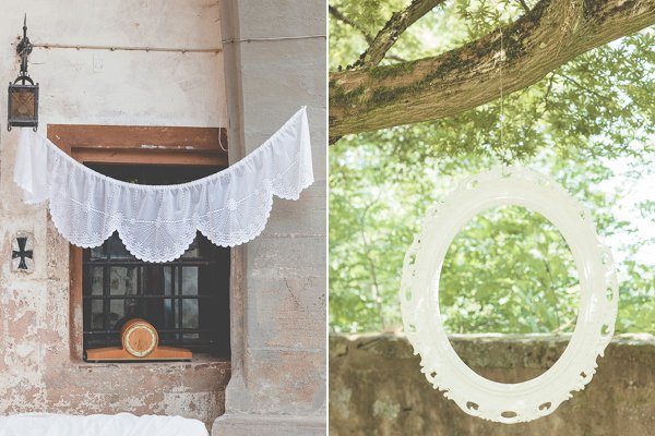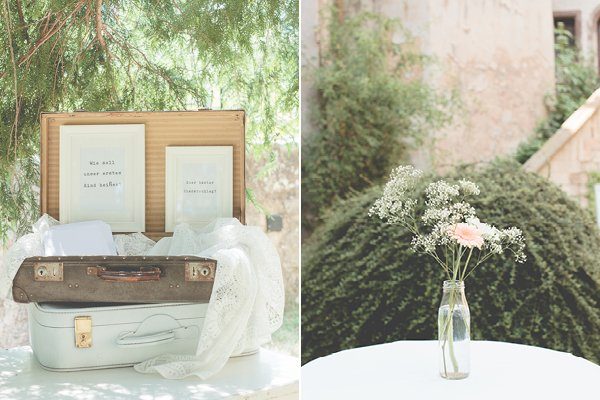 Die Dekoration war im Shabby Chic Stil gehalten, passend zum Schloss und der Umgebung. Wir ein besonderes Gästebuch, in einem alten Koffer waren Kärtchen ausgelegt, auf denen die Gäste ihren besten Ratschlag für die Ehe oder Namensvorschläge für unser erstes Kind abgeben konnten, das Ergebnis waren viele lustige Inspirationen. Außerdem gab es eine leckere Candybar, eine Photobooth und mehrere Sofas und Sitzgelegenheiten im Schlosshof. Vor der Trauung konnten sich die Gäste einen Fächer mitnehmen, auf dem die Liedtexte aufgedruckt waren. Die Rückseite zierte das gleiche Muster wie unsere Hochzeitseinladungen. Die alten Bilder- und Fensterrahmen im Hintergrund der freien Trauung waren vom Flohmarkt und wurden von mir angestrichen.