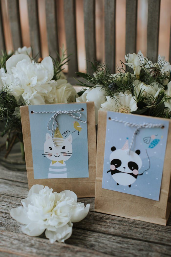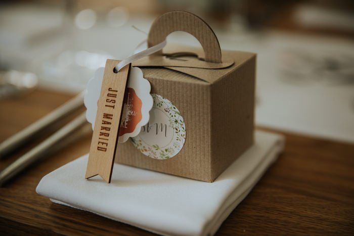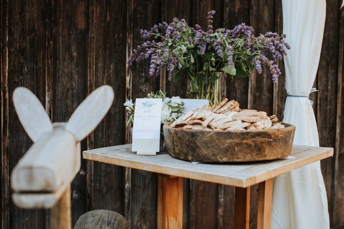 Am Abend zog die Gesellschaft nach drinnen, im das Dinner zu genießen. Das rustikale Interieur setzte sich drinnen fort. Die einfachen Holztische waren mit schönen Blumensträußen geschmückt, in denen die Tischnummern aus Holz steckten. Gastgeschenke in Kraftpapierboxen warteten auf die Gäste und die Kleinsten nehmen am liebevoll dekorierten. Kindertisch Platz.