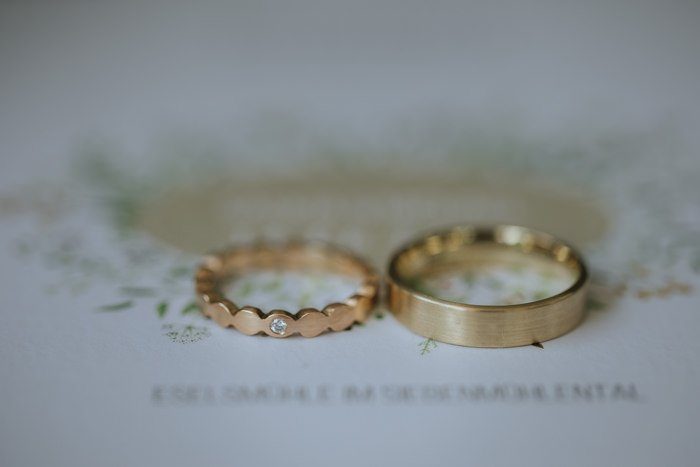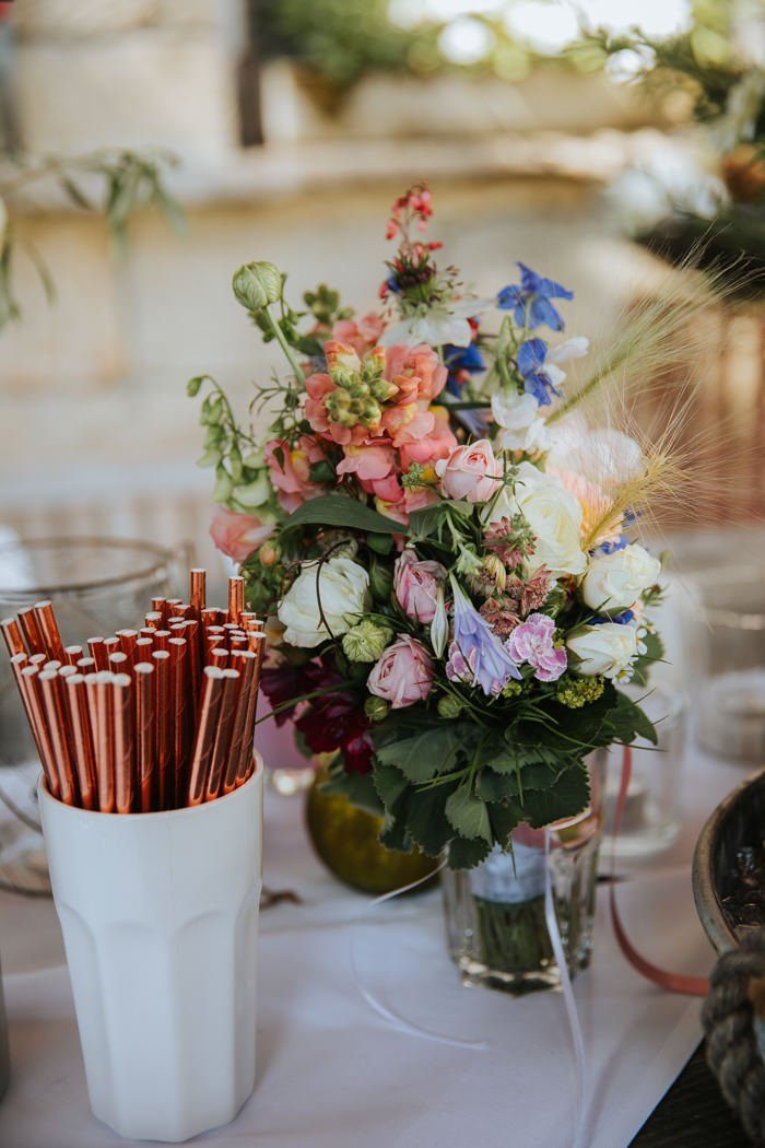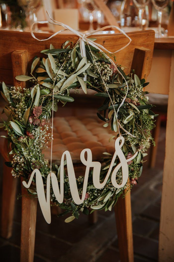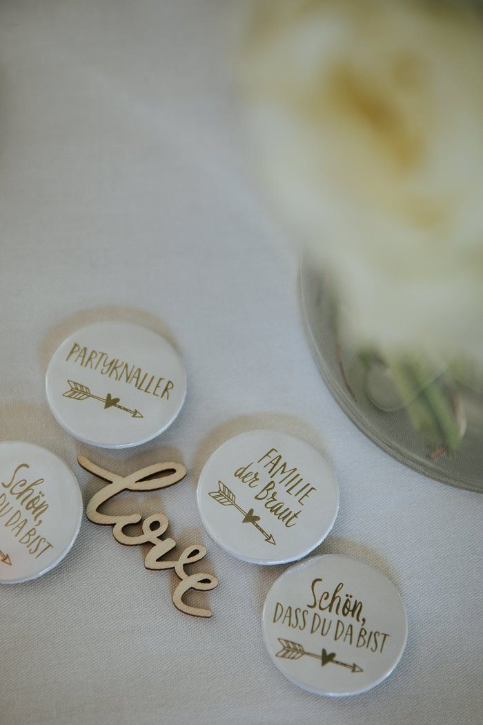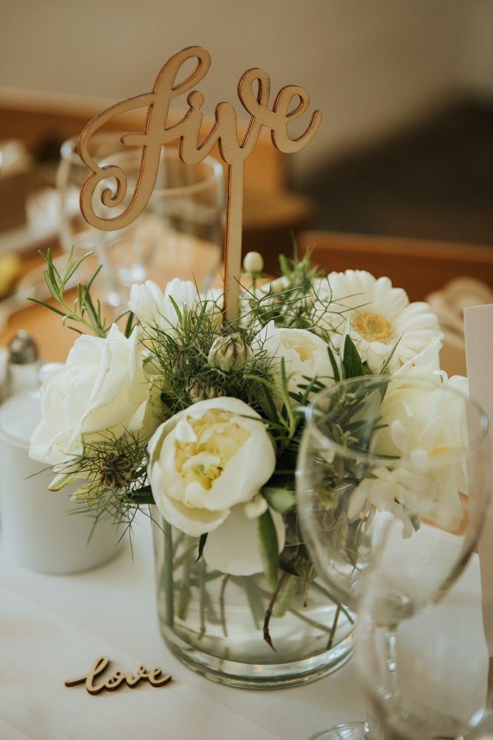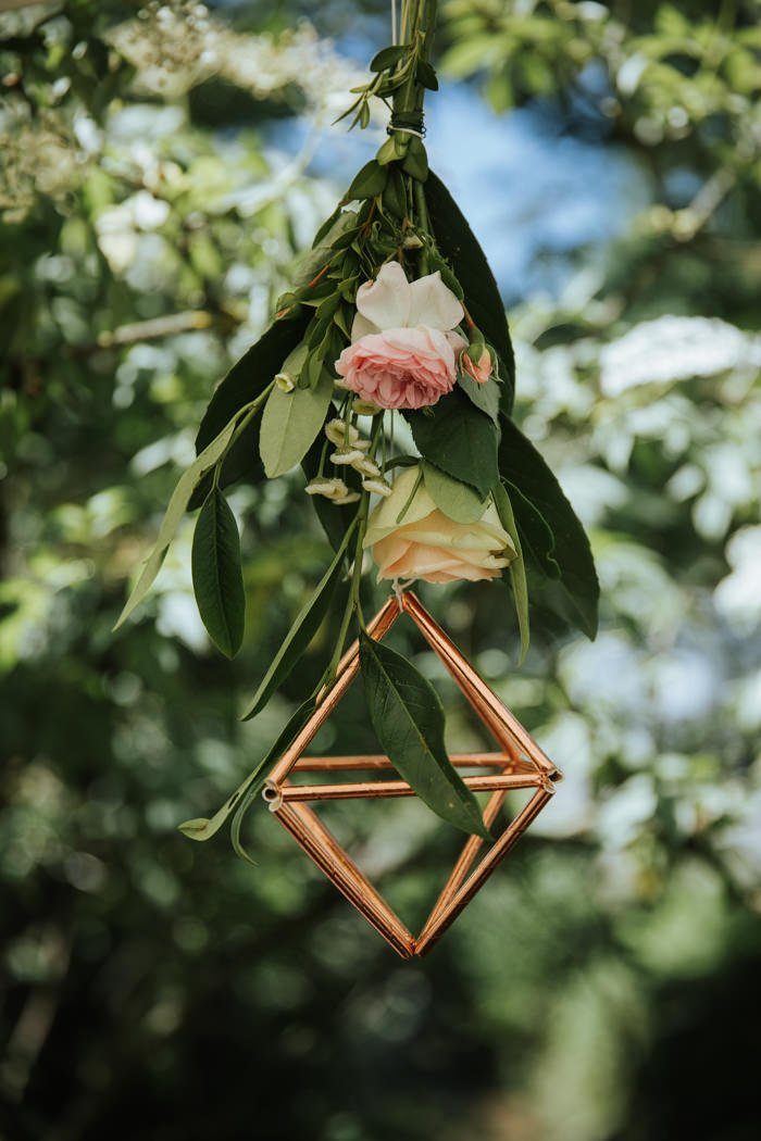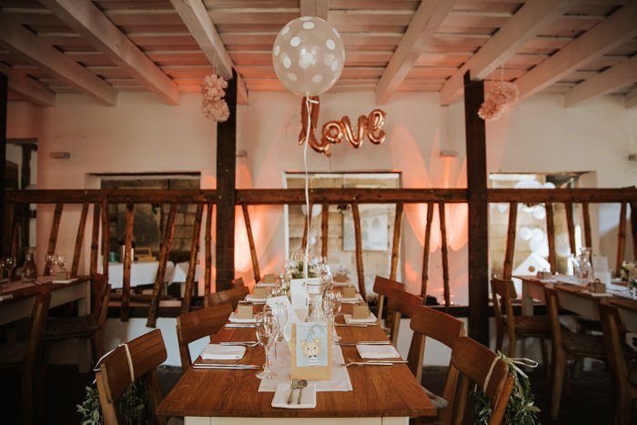 Das rustikal ländliche Ambiente der Mühle haben die beiden mit einigen modernen Details ins Roségold kombiniert. Diamanten aus roségoldenen Strohhalmen (ein cooles DIY der Braut!) hingen an kleinen Blumengebinden und der beliebte Love Script Ballon prangte in der Location. Hinzu kamen mehrere Details aus Holz, wie z.B. der Cake Topper oder die kleinen Love Schriftzüge, die als Streudeko überall verteilt waren.