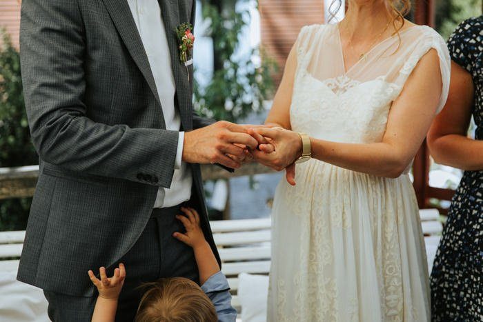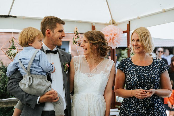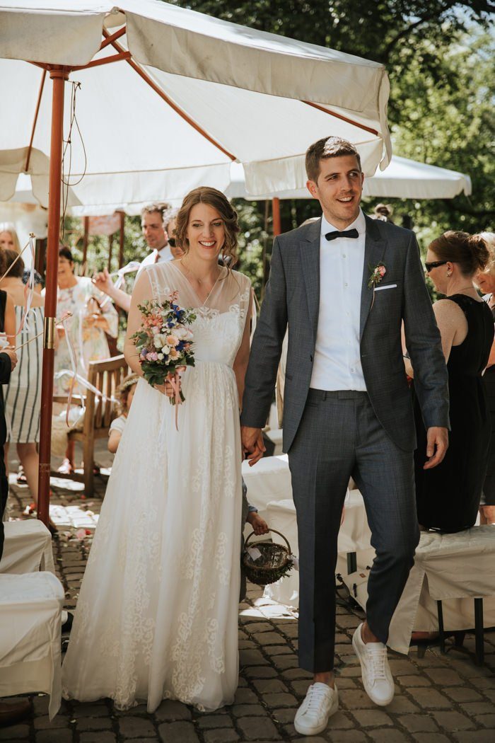 Mit ihrem kleinen Sohn erlebten sie diese Momente und gaben sich vor den Augen von Familie und Freunden das Jawort. Unter den klingenden Glöckchen der Wedding Wands zog das frisch vermählte Paar aus, um mit der Gesellschaft zu feiern.