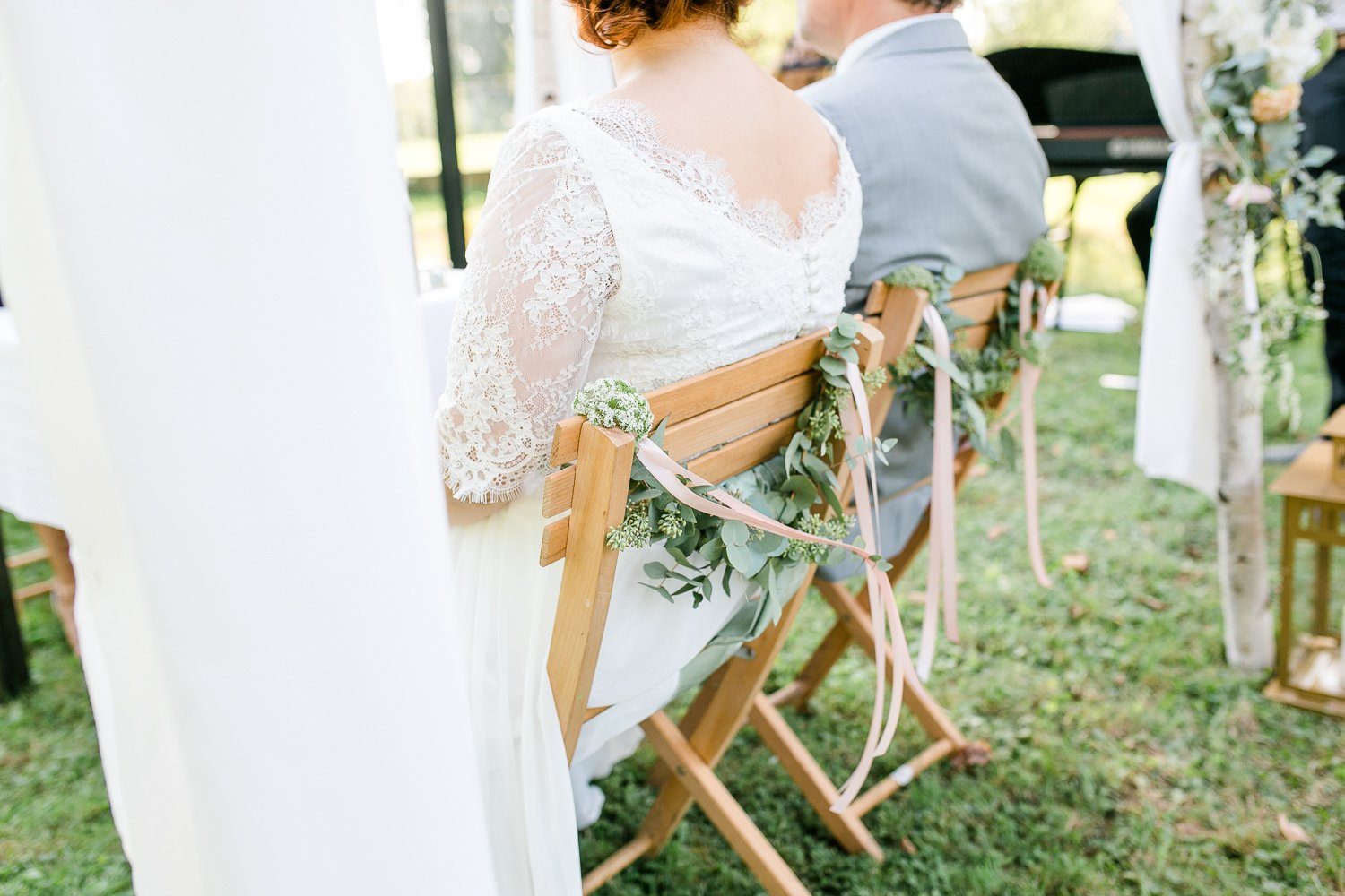Die Trauung fand im Freien im Schatten eines großen Baumes auf einer Wiese bei der Location statt. Ein wunderschöner Baldachin aus Birkenstämmen wurde mit weißen Stoffbahnen und Blumen geschmückt. Er gab der Zeremonie mit freier Trauung einen feierlichen Rahmen. Die Ideen für die Dekorationen vor Ort haben Nora und Andreas selbst entwickelt.
