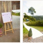Ein ‘blauer’ Faden zog sich durch den ganzen Tag. Von der Save the Date Karte durch die gesamte Papeterie bis hin zum teilweise blauen Himmel. Um das richtige Papier und das richtige Blau für alle Bestandteile zu finden, wurde Theresia zur Meisterdetektivin. Besonderes Highlight der Tischdeko waren die Scheiben aus Achat, in die die Namen und das Hochzeitslogo eingraviert waren und so als Platzkärtchen dienten. Auch beim Gastgeschenk, einer kleinen Schachtel mit einer feinen Praline samt ‘Love is sweet’ Aufdruck setzte Theresia alles daran, sie passend zur Papeterie gestalten. So wurden die kleinen Standardschachteln kurzerhand mit dem passenden Papier eingekleidet und reihten sich perfekt in die Tischdeko ein.
