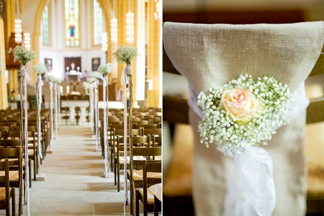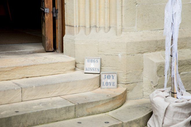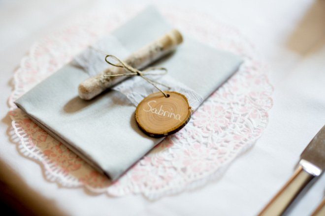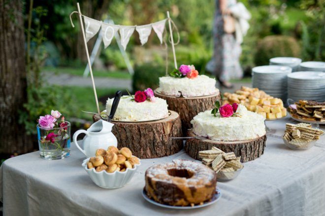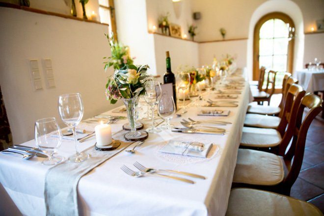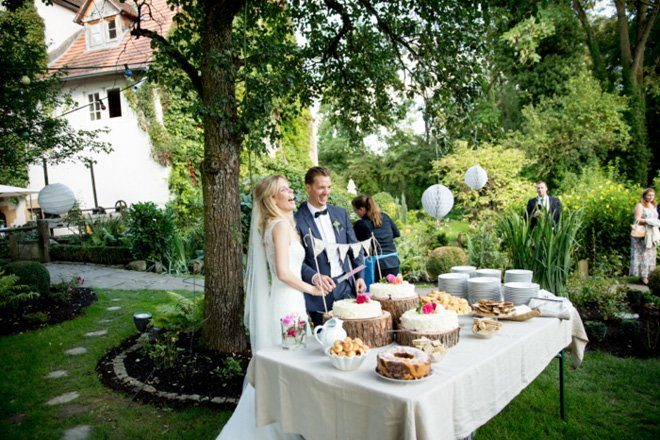 Die liebevolle Dekoration aus Jute, Spitze und Kraftpapier passte hervorragend zum Hochzeitsstil und setzte sich auch in der Location fort. Vasen mit Wiesenblumen, Tischläufer aus Leinen und Spitzendeckchen zierten die Tische. Die Hochzeitstorte wurde auf Tortenständern aus selbst geschnittenen Holzscheiben präsentiert, kleine Wimpelketten wackelten fröhlich umher.