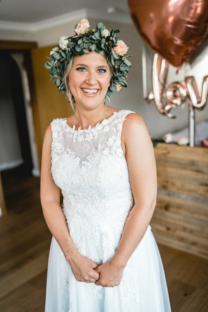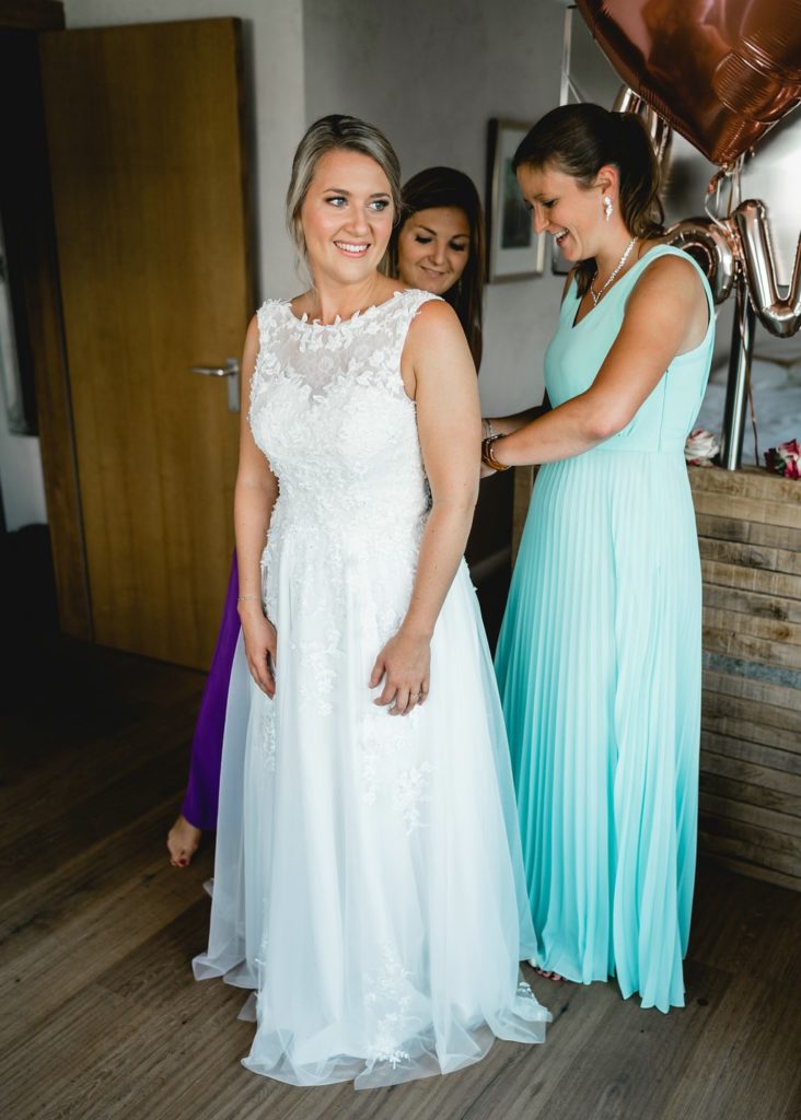 Gemeinsam mit den Mädels bereitet sich die Braut auf den großen Tag vor. Haare, Make-up, Brautkleid und ein üppiger Blumenkranz für die Haare verwandeln sie in die weibliche Hauptperson.