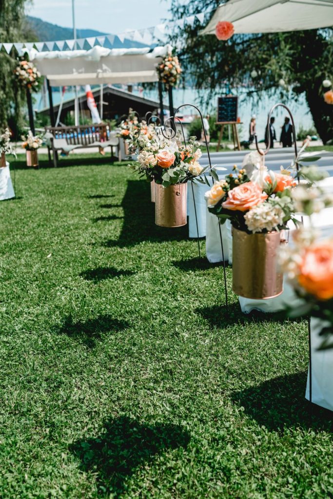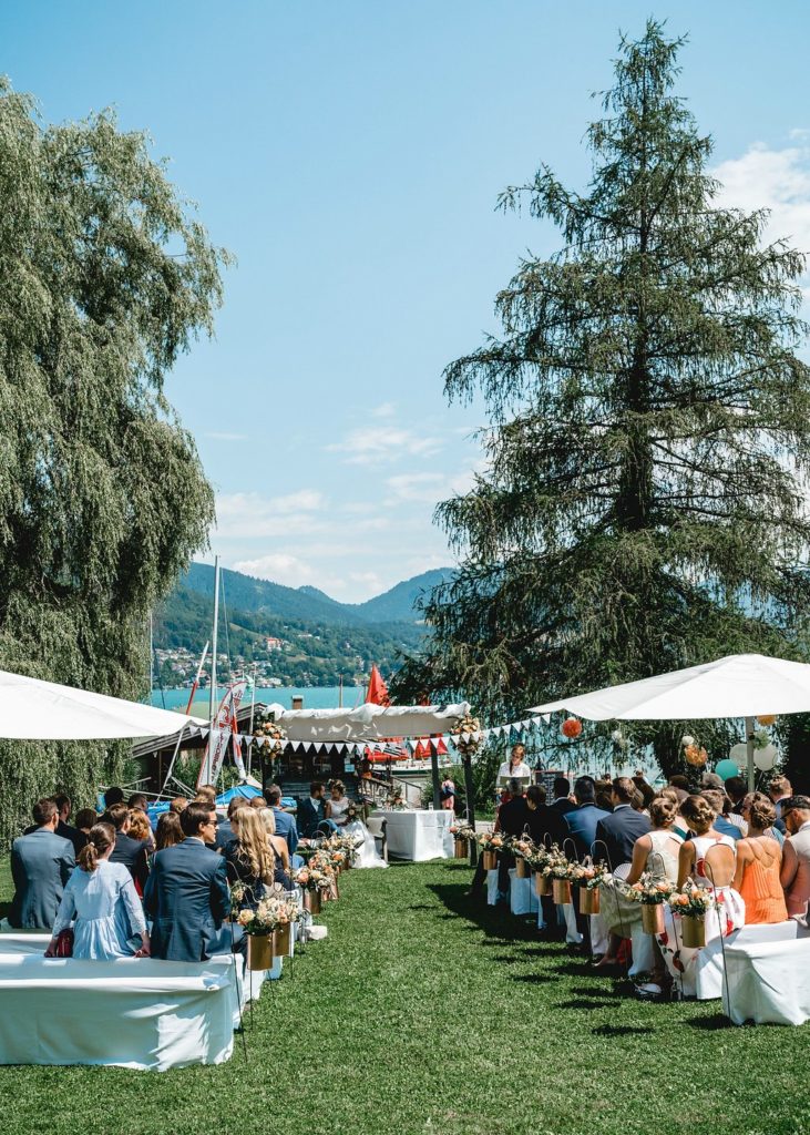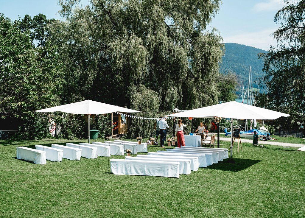 Wie schön kann bitte eine freie Trauung am See sein?! Weiße Bänke, große Sonnenschirme und fröhliche Gäste. Hinter dem Brautpaar der funkelnde See, darüber ein strahlend blauer Himmel. Ok, merkt man, dass ich so langsam eine große Sommersehnsucht entwickle?