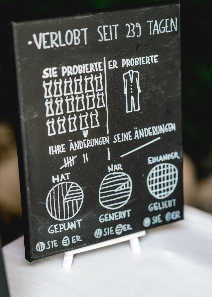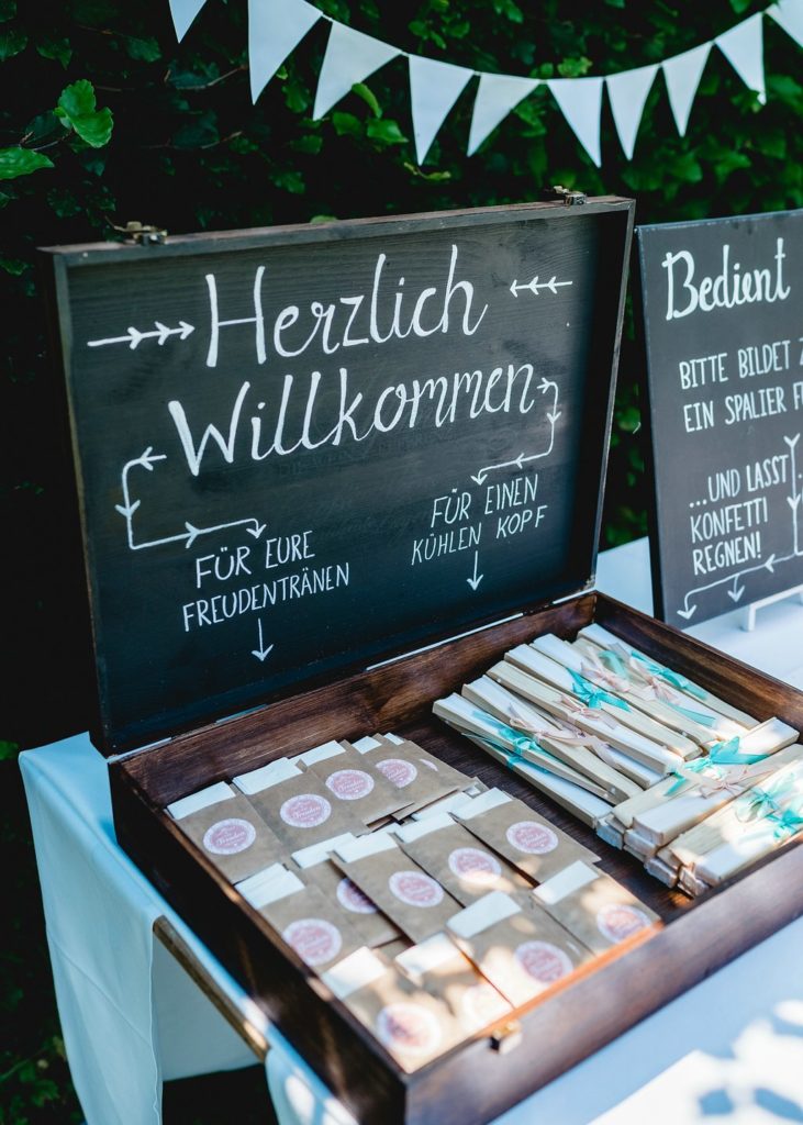 Wie gut dass die beiden an Taschentücher für die Freudentränen und Papierfächer für eine kühlende Brise gedacht haben! An heißen Tagen solltet Ihr auch unbedingt kleine Wasserflaschen bereit halten. So kümmert man sich um seine Gäste!