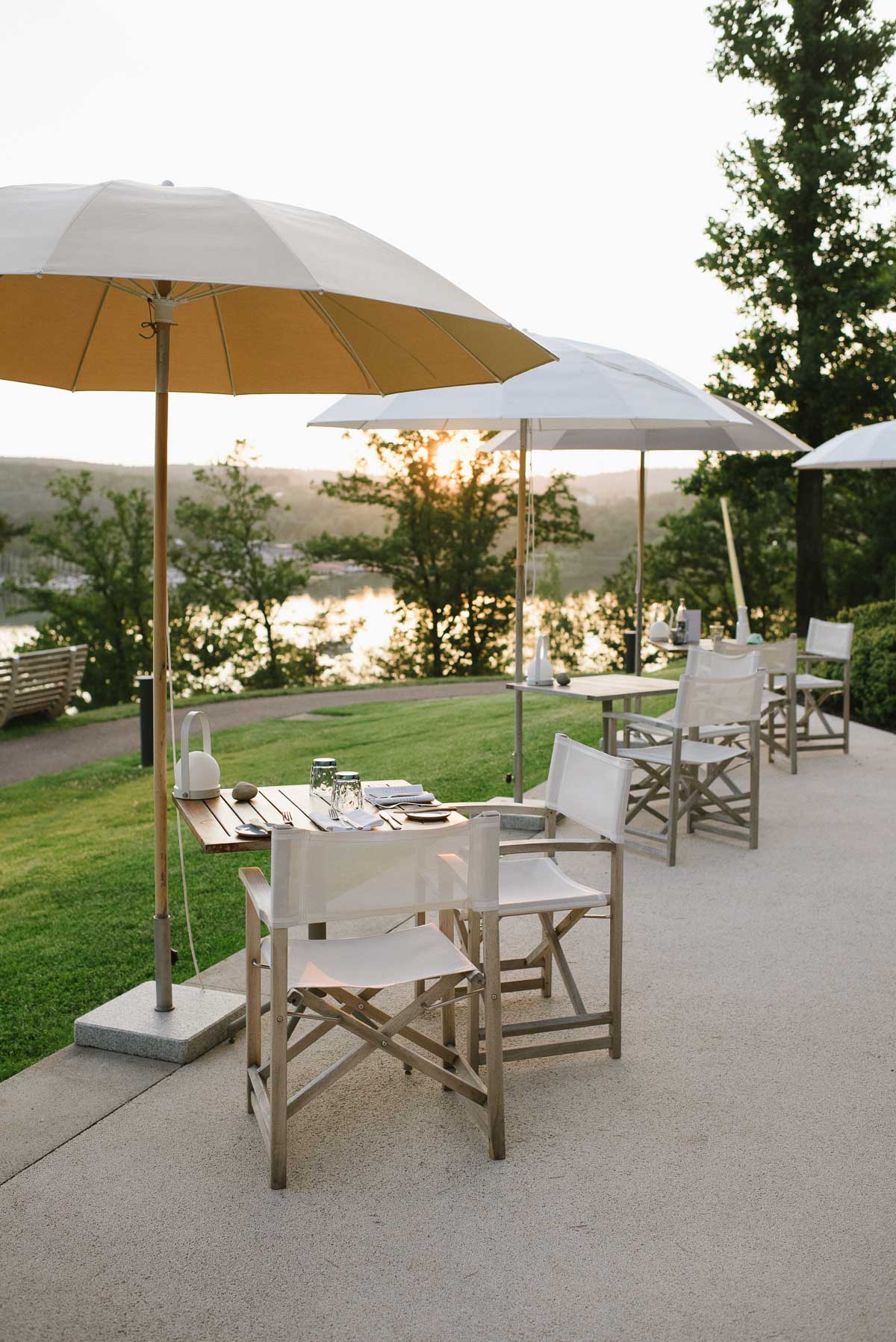 Die untergehende Sonne lässt nicht nur die Terrasse im goldenen Licht erstrahlen, sondern scheint bis zu ihrem verschwinden am kleinen Yachthafen in die Innenräume des Hotels.