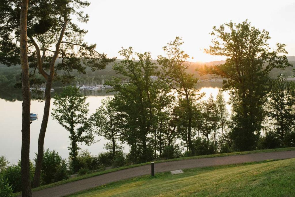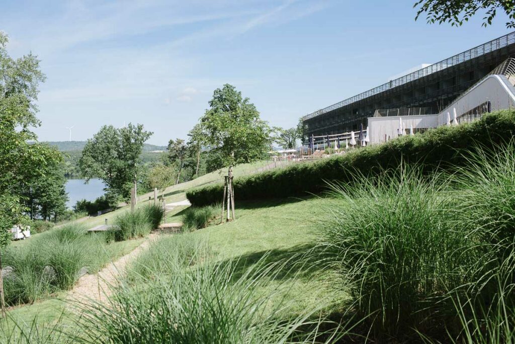 Das Hotel Seezeitlodge liegt am Bostalsee, eine Stausee, der Ende der 60er Jahre entstand. Witzigerweise sieht man weder den See noch das Hotel bis man die Lobby betritt. Es integriert sich elegant in die Natur, schmiegt sich an den Hang und tut alles, um nicht aufzufallen und dennoch das Schönste zu ermöglichen.