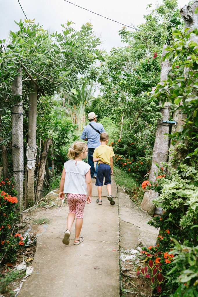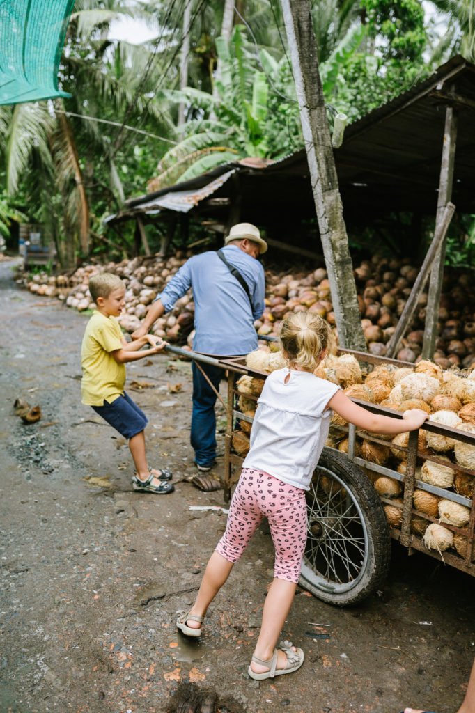 Unser Guide, der dort aufgewachsen war, organisierte eine abwechslungsreiche Tour mit Marktbesuch, Floßfahrt (wie breit ist dieser Fluss?!), Dorfbesuch, Tuktuk Fahrt, Besuch einer Kokosnuss Verarbeitung und authentischem Mittagessen.