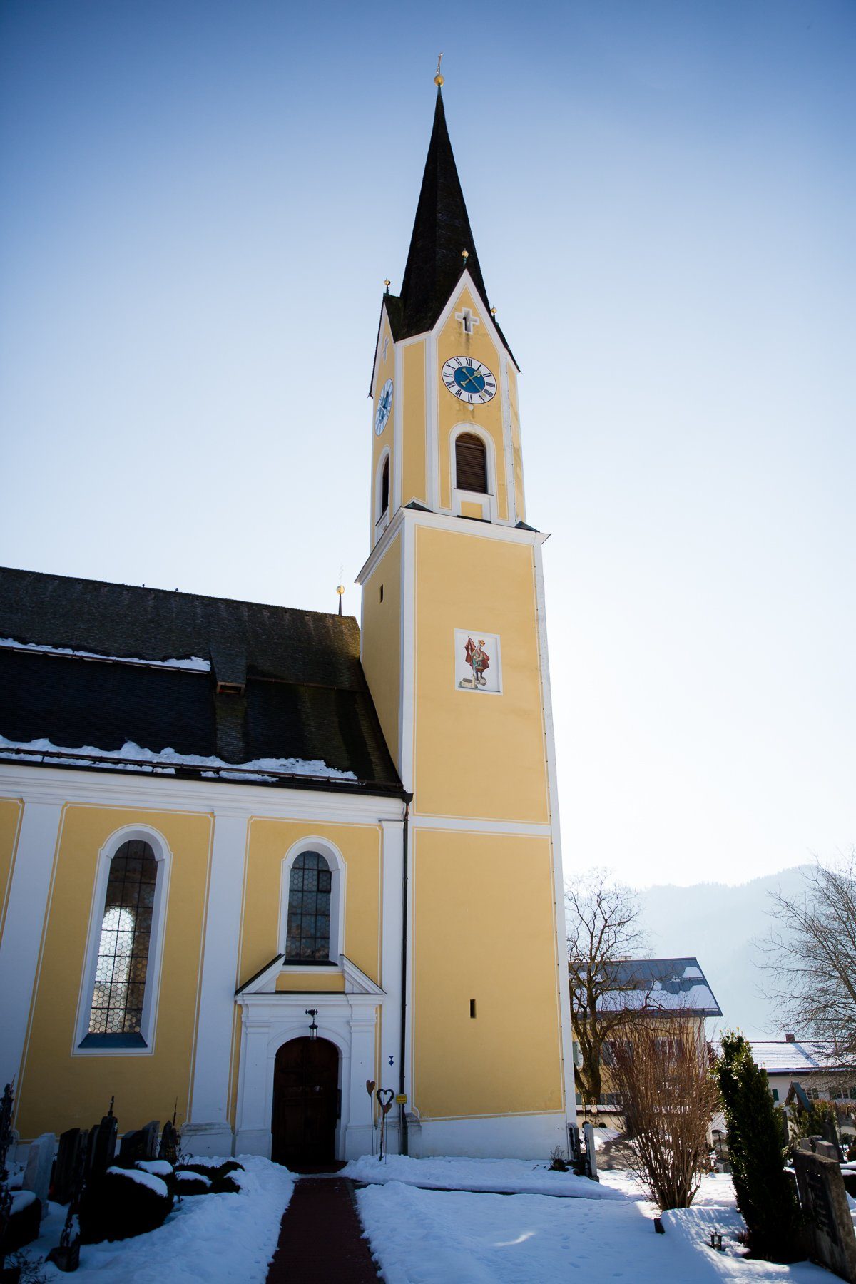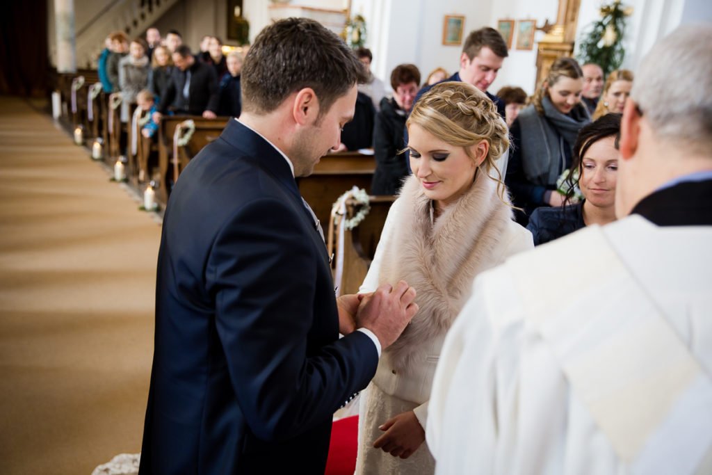 Pünktlich zur kirchlichen Trauung am Nachmittag spitzelte die Sonne durch und lies die Schneelandschaft funkeln. Die Kirche war stimmungsvoll mit Kerzen am Mittelgang und kleinen Kränzen an den Bänken geschmückt. Weiche Fleecedecken lagen bereit, um fröstelnde Gäste zu wärmen. Das Brautpaar schritt gemeinsam zu Altar, um sich das Ja-Wort zu geben.