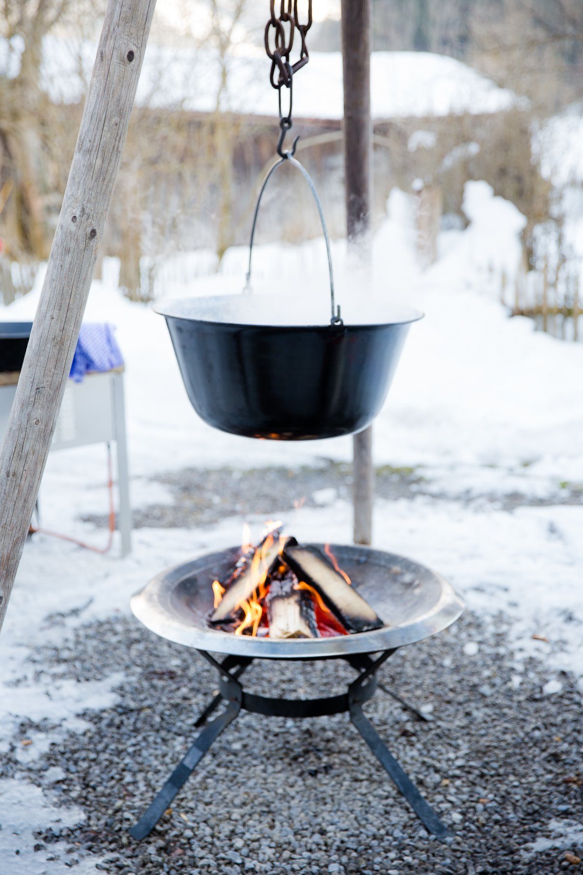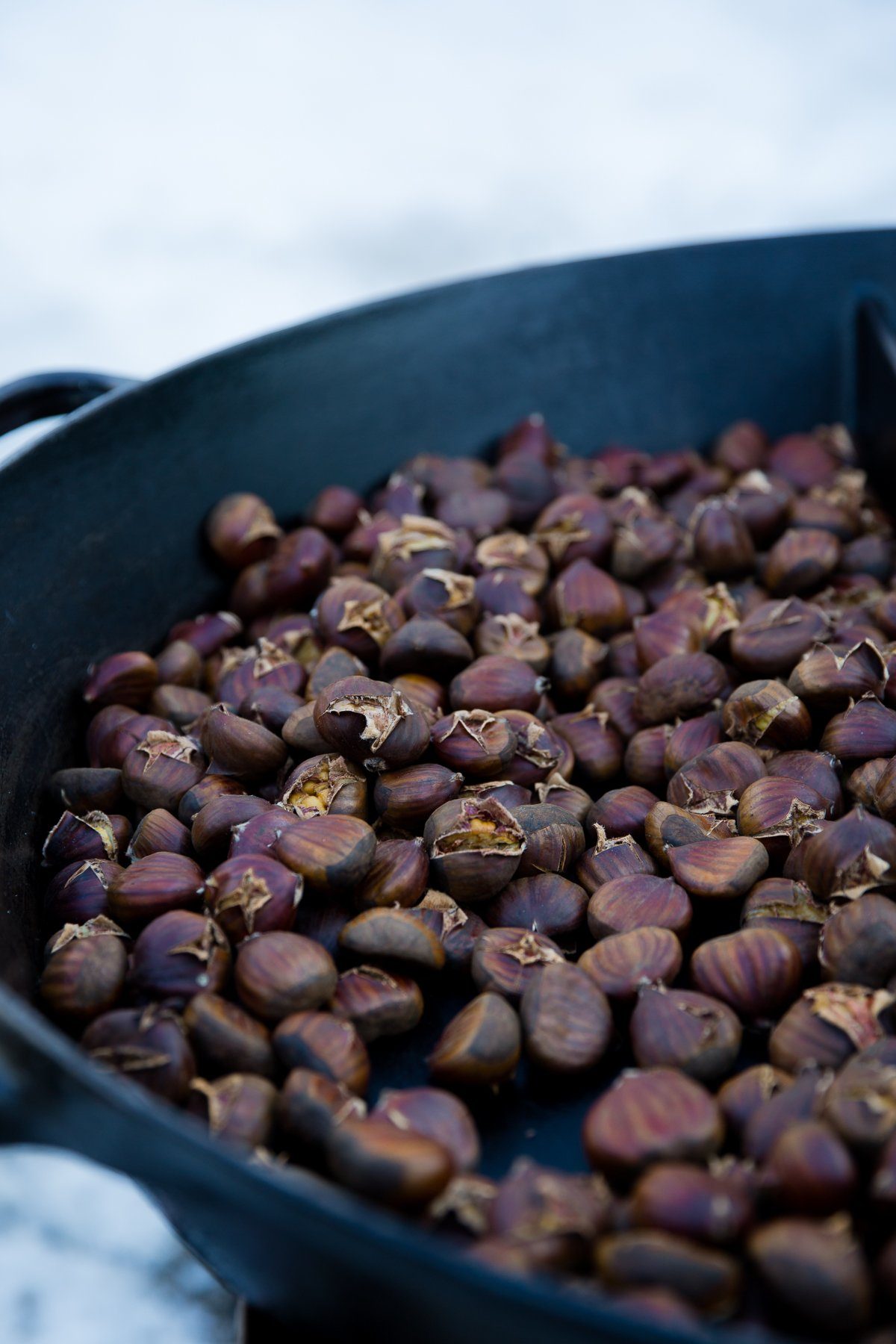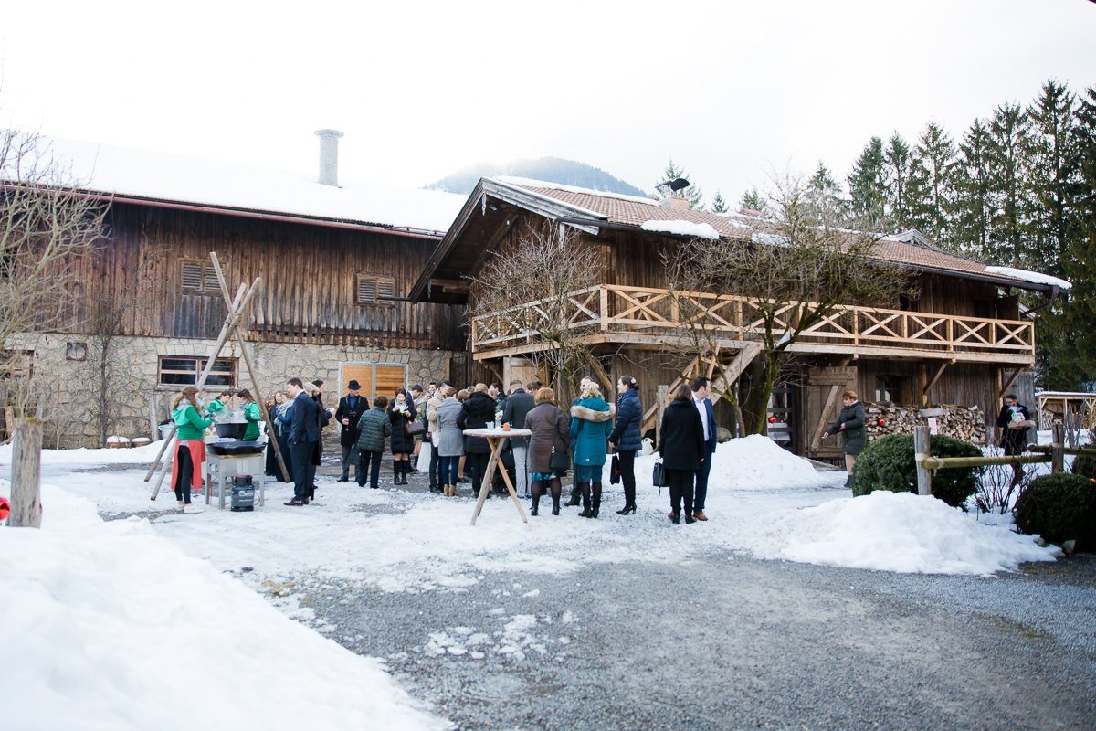 Beim Duft von frisch gerösteten Kastanien und Lagerfeuer fand sich die Gesellschaft im Hasenöhrl Hof ein, um auf das frisch getraute Paar anzustoßen. Selbst an einem Wintertag kann man den Empfang im Freien abhalten, so lange es trocken ist und die Gäste die Möglichkeiten haben sich aufzuwärmen.