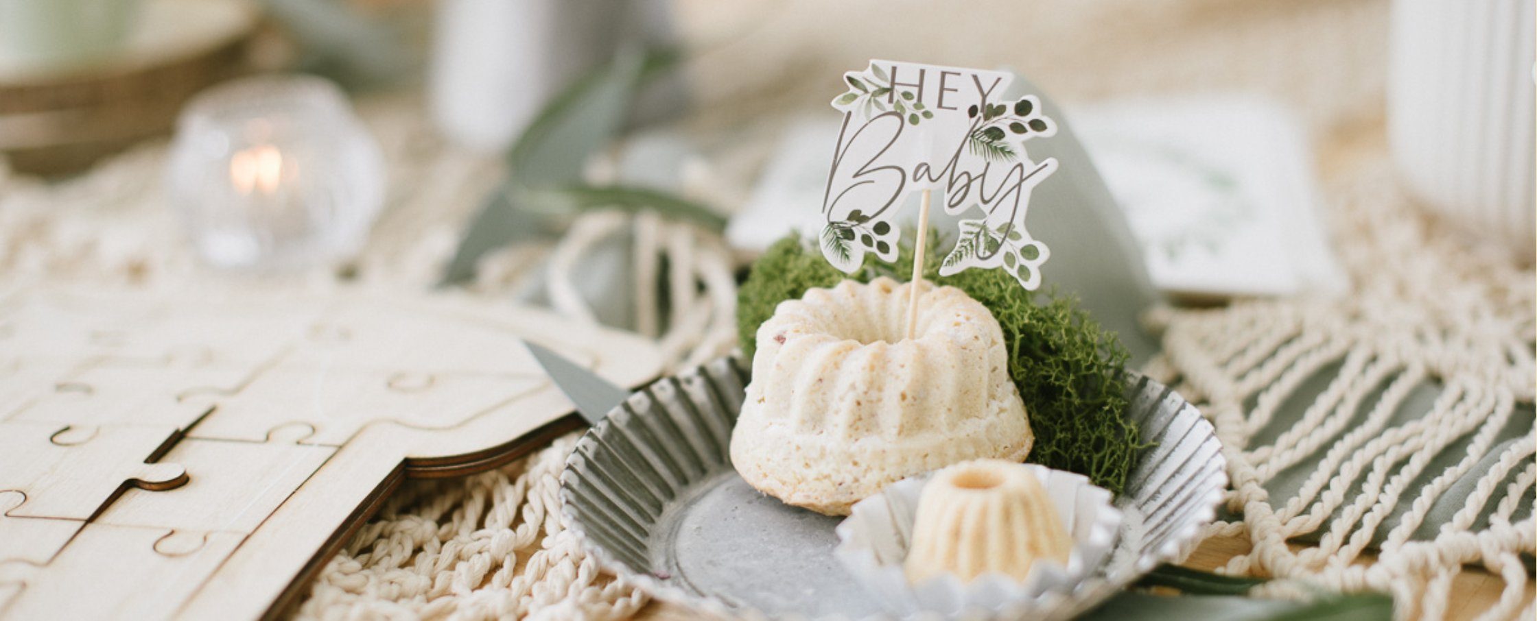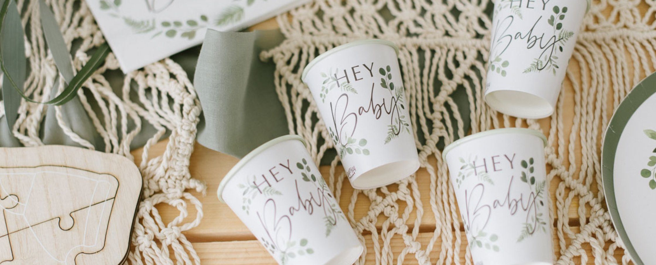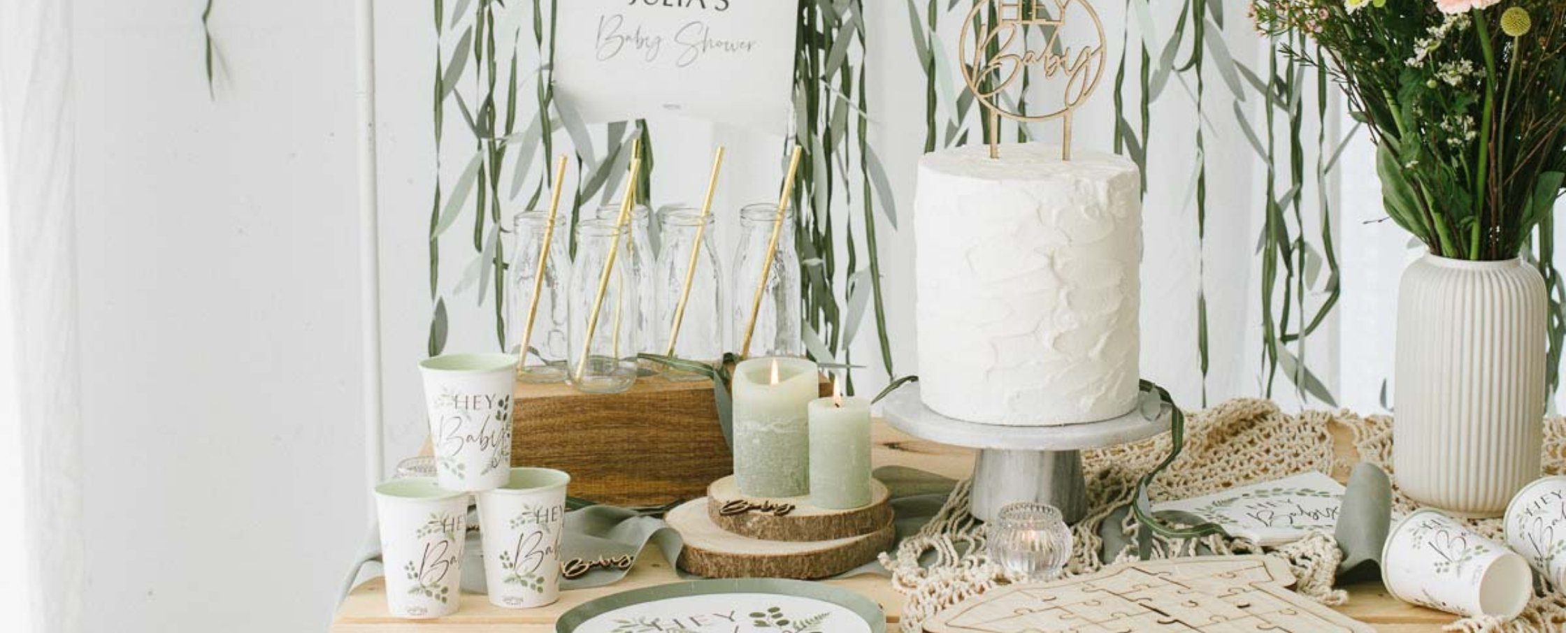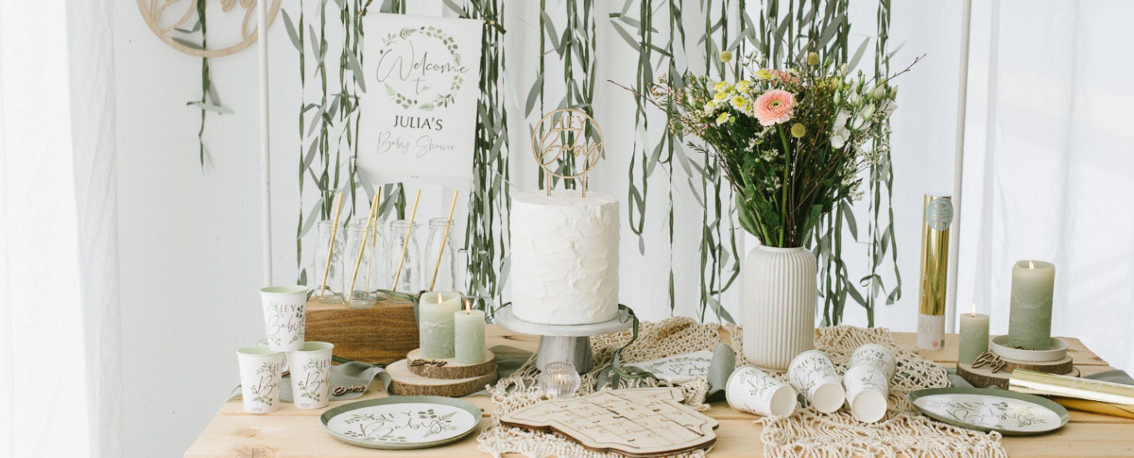 Nicht mehr lange! Die Geburt rückt immer näher! Die Babyparty wird selbstverständlich mit den engsten Freundinnen gefeiert! Mit unseren Dekoideen kreiert Ihr eine fröhliche Baby Party im Greenery Look. Girlanden aus Holz, Caketopper, Wimpel und Gästebuch haben wir für die Baby Shower. Mit Servietten, Konfetti und einer Macramee-Tischläufern wird die Babyshower unvergesslich. Im Blogpost gibt es weitere Inspirationen für eure Botanical Babyparty.