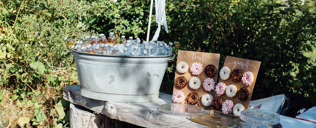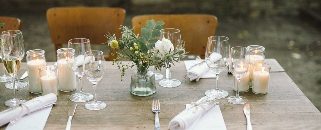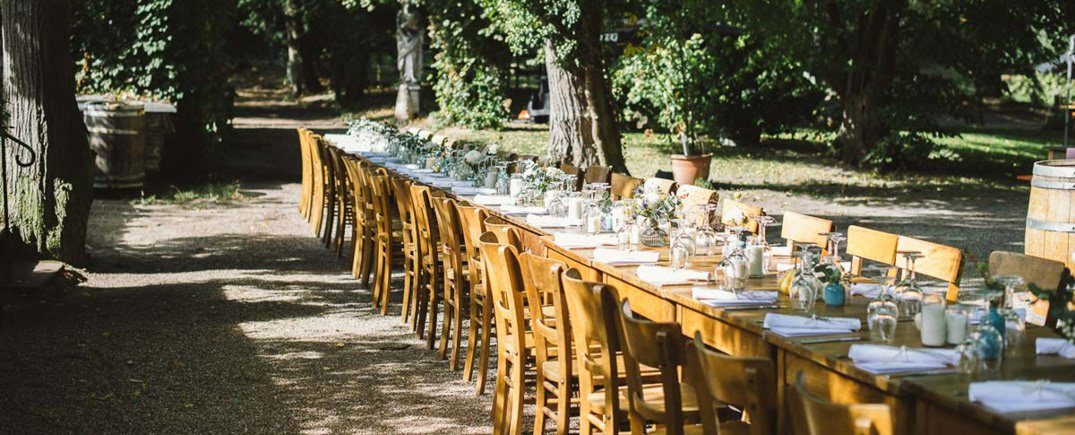 Feiern im Weingut ist herrlich! Umgeben von einem Meer aus Reben feiert Ihr ein ausgelassenes und entspanntes Fest. Die Dekoration ist rustikal gemütlich. Sie kombiniert natürliche Materialien wie Holz und Leinen mit sanften Farben. Viele Kerzen auf den Tischen, leuchtende Lichttüten in der Location verteilt und Lichterketten zwischen den Bäumen kreieren eine wunderschöne Atmosphäre am Abend.